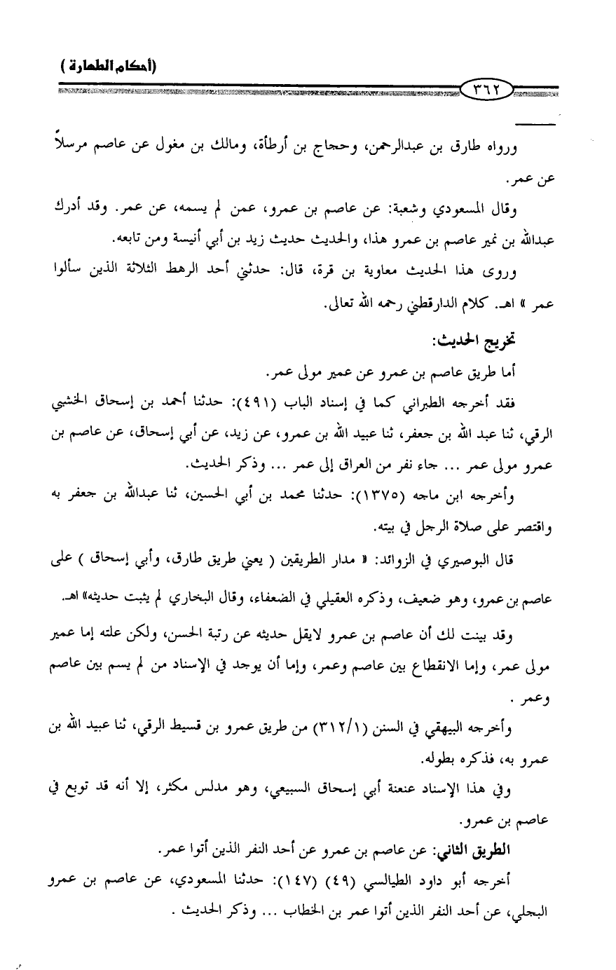 وقد بينت لك أن عاصم بن عمرو لا يقل حديثه عن رتبة الحسن، ولكن علته إما عمير مولى عمر، وإما الانقطاع بين عاصم وعمر، وإما أن يوجد في الإسناد من لم يسم بين عاصم وعمر.