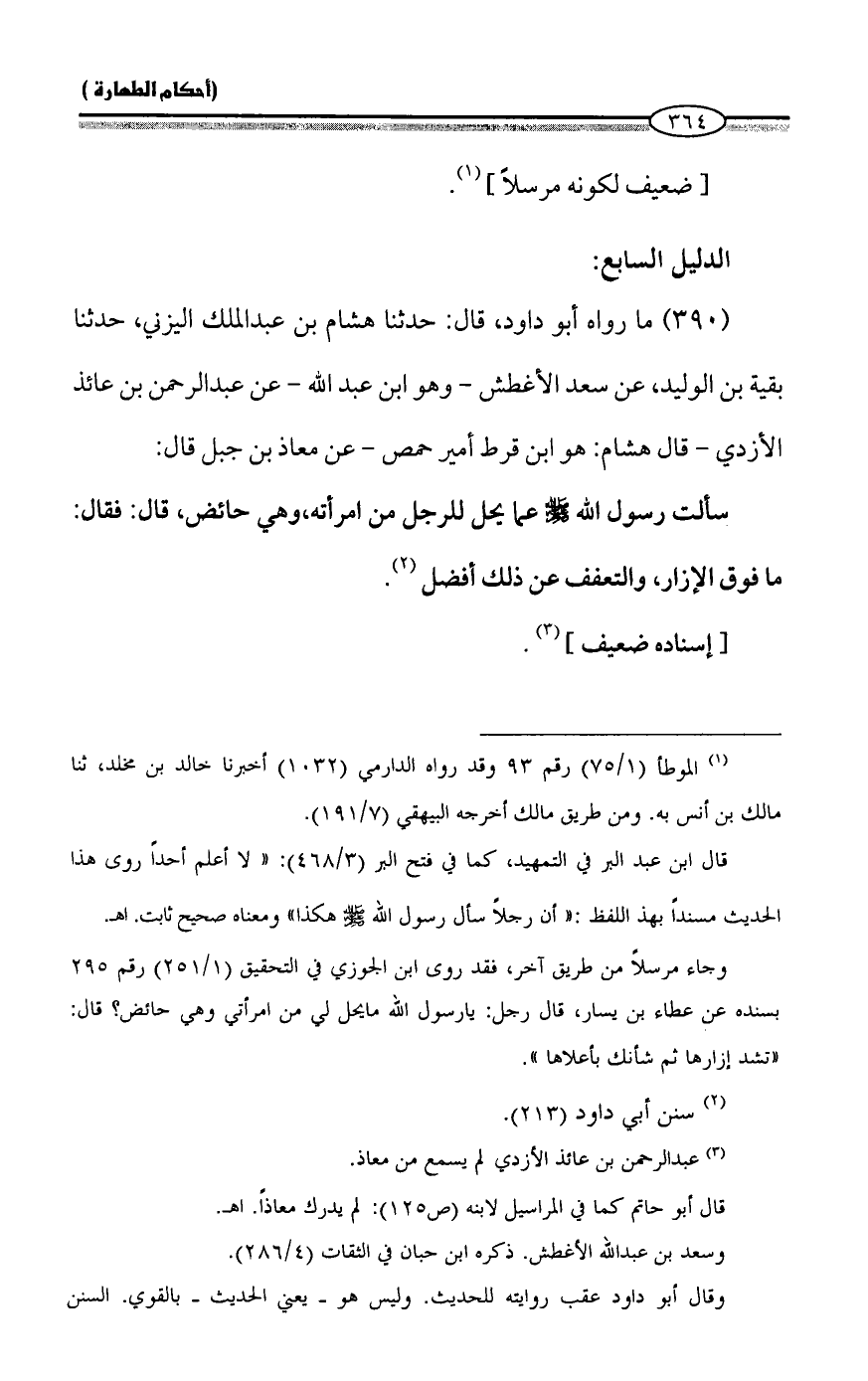 (390) ما رواه أبو داود، قال: حدثنا هشام بن عبد الملك اليزني، حدثنا بقية بن الوليد، عن سعد الأغطش - وهو ابن عبد الله - عن عبد الرحمن بن عائذ الأزدي - قال هشام: هو ابن قرط أمير حمص - عن معاذ بن جبل قال:
