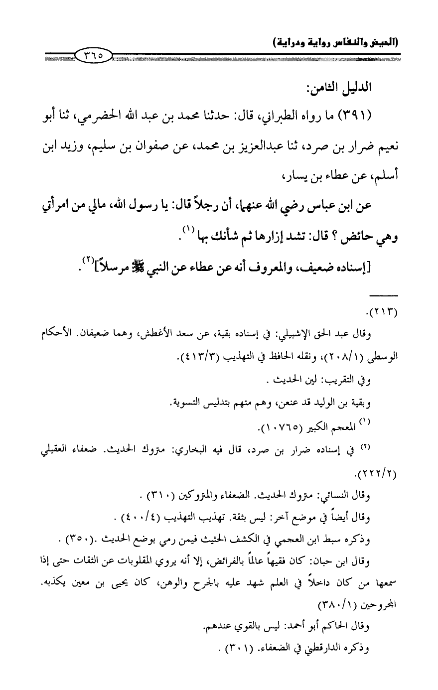 وقال عبد الحق الإشبيلي: في إسناده بقية، عن سعد الأغطش، وهما ضعيفان. الأحكام الوسطى (1/ 208)، ونقله الحافظ في التهذيب (3/ 413).