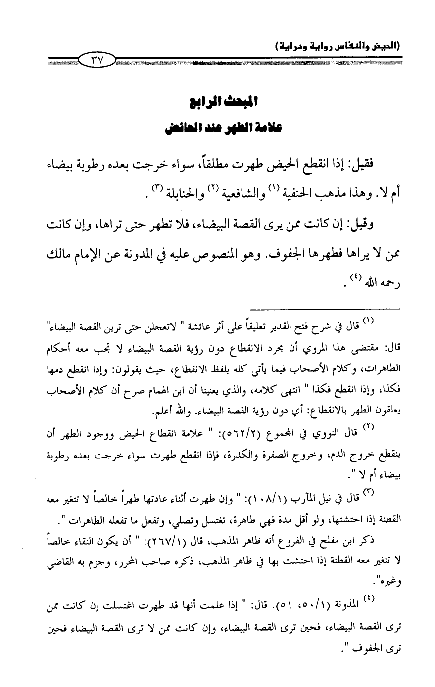 (¬4) المدونة (1/ 50، 51). قال: "إذا علمت أنها قد طهرت اغتسلت إن كانت ممن ترى القصة البيضاء، فحين ترى القصة البيضاء، وإن كانت ممن لا ترى القصة البيضاء فحين ترى الجفوف".