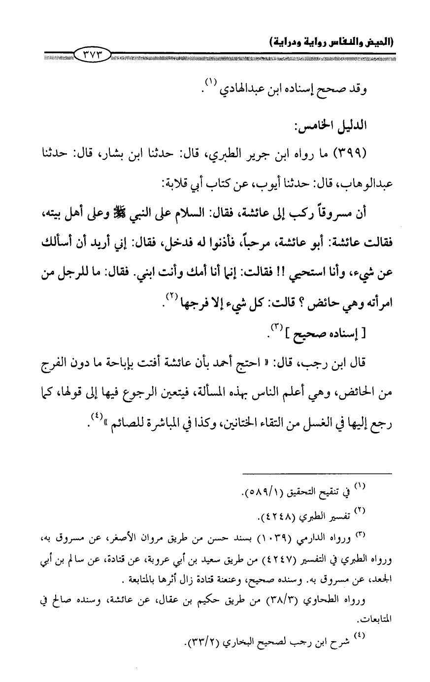 قال ابن رجب، قال: "احتج أحمد بأن عائشة أفتت بإباحة ما دون الفرج من الحائض، وهي أعلم الناس بهذه المسألة، فيتعين الرجوع فيها إلى قولها، كما رجع إليها في الغسل من التقاء الختانين، وكذا في المباشرة للصائم" (¬4).