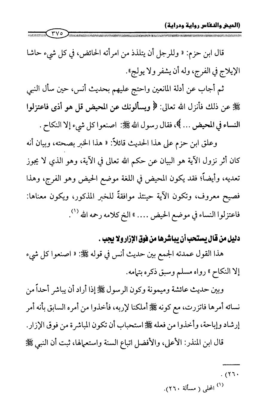 ثم أجاب عن أدلة المانعين واحتج عليهم بحديث أنس، حين سأل النبي - صلى الله عليه وسلم - عن ذلك فأنزل الله تعالى: {وَيَسْأَلُونَكَ عَنِ الْمَحِيضِ قُلْ هُوَ أَذًى فَاعْتَزِلُوا النِّسَاءَ فِي الْمَحِيضِ ...}، فقال رسول الله - صلى الله عليه وسلم -: اصنعوا كل شيء إلا النكاح.