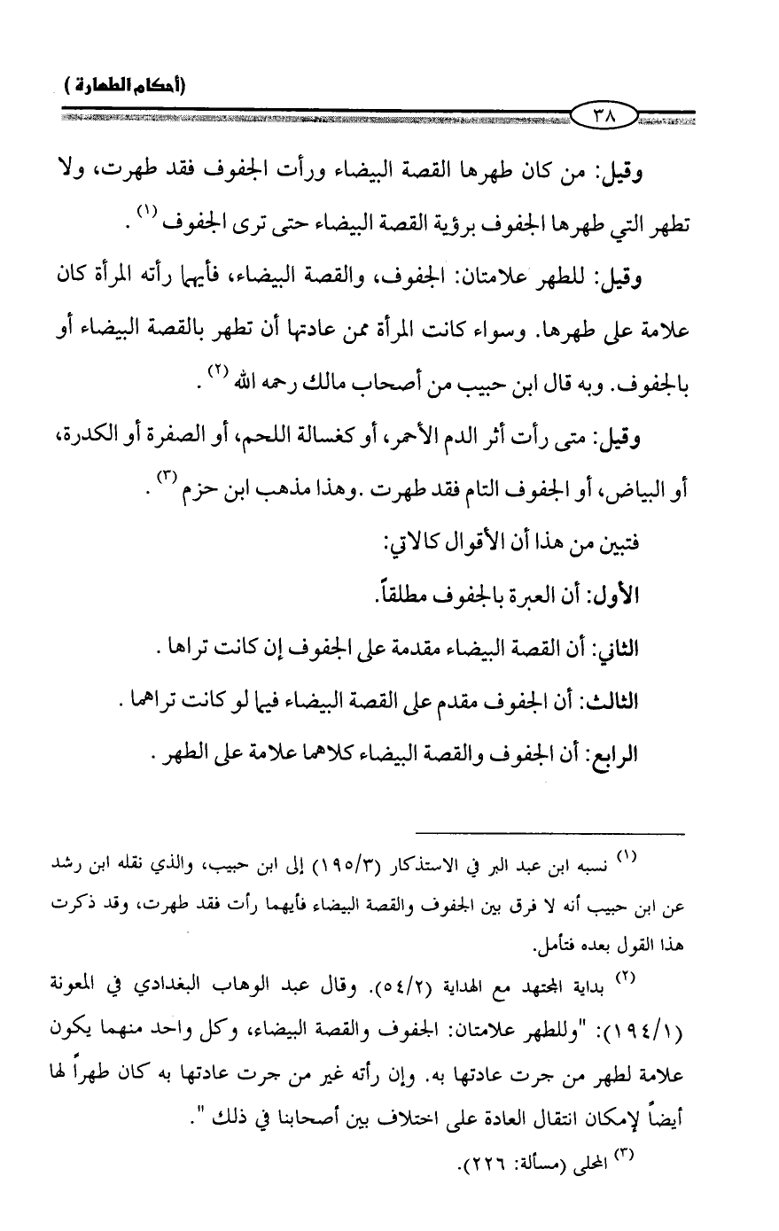 (¬2) بداية المجتهد مع الهداية (2/ 54). وقال عبد الوهاب البغدادي في المعونة (1/ 194): "وللطهر علامتان: الجفوف والقصة البيضاء، وكل واحد منهما يكون علامة لطهر من جرت عادتها به. وإن رأته غير من جرت عادتها به كان طهراً لها أيضاً لإمكان انتقال العادة على اختلاف بين أصحابنا في ذلك".