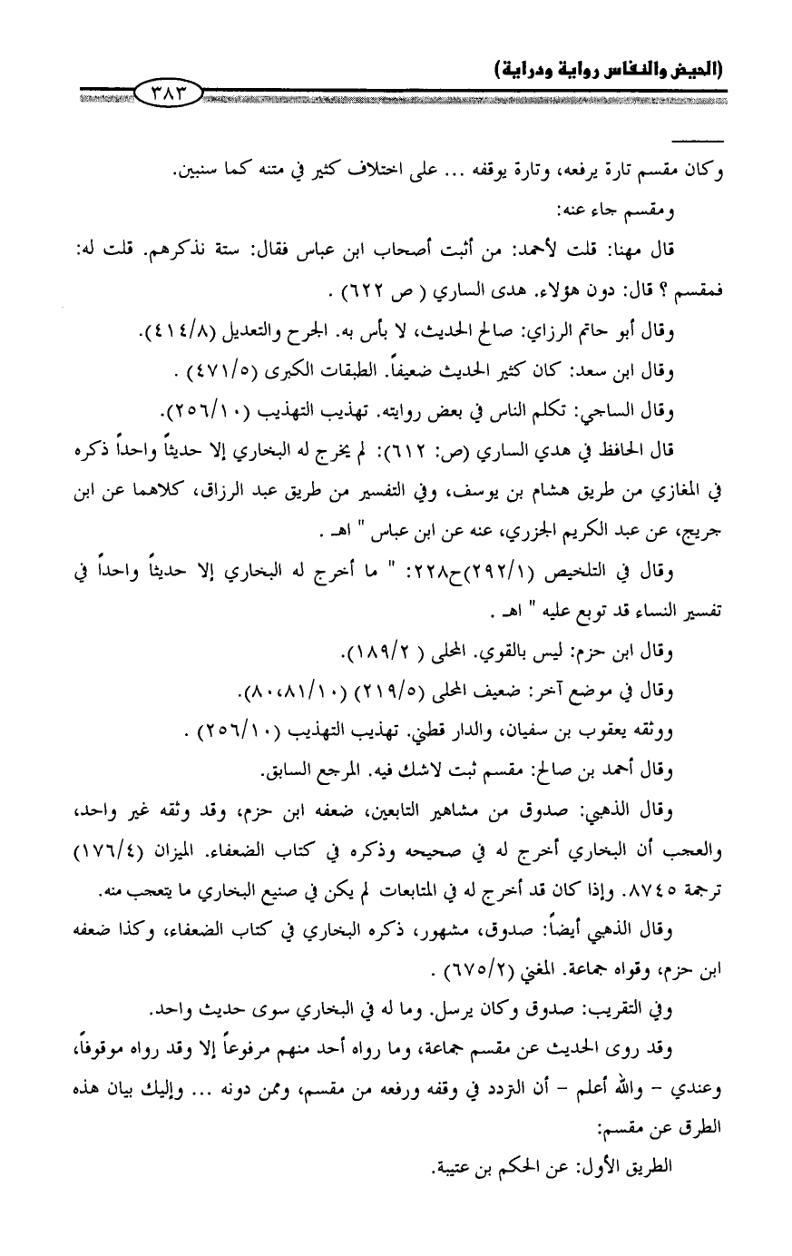 وقد روى الحديث عن مقسم جماعة، وما رواه أحد منهم مرفوعاً إلا وقد رواه موقوفاً، وعندي - والله أعلم - أن التردد في وقفه ورفعه من مقسم، وممن دونه ... وإليك بيان هذه الطرق عن مقسم: