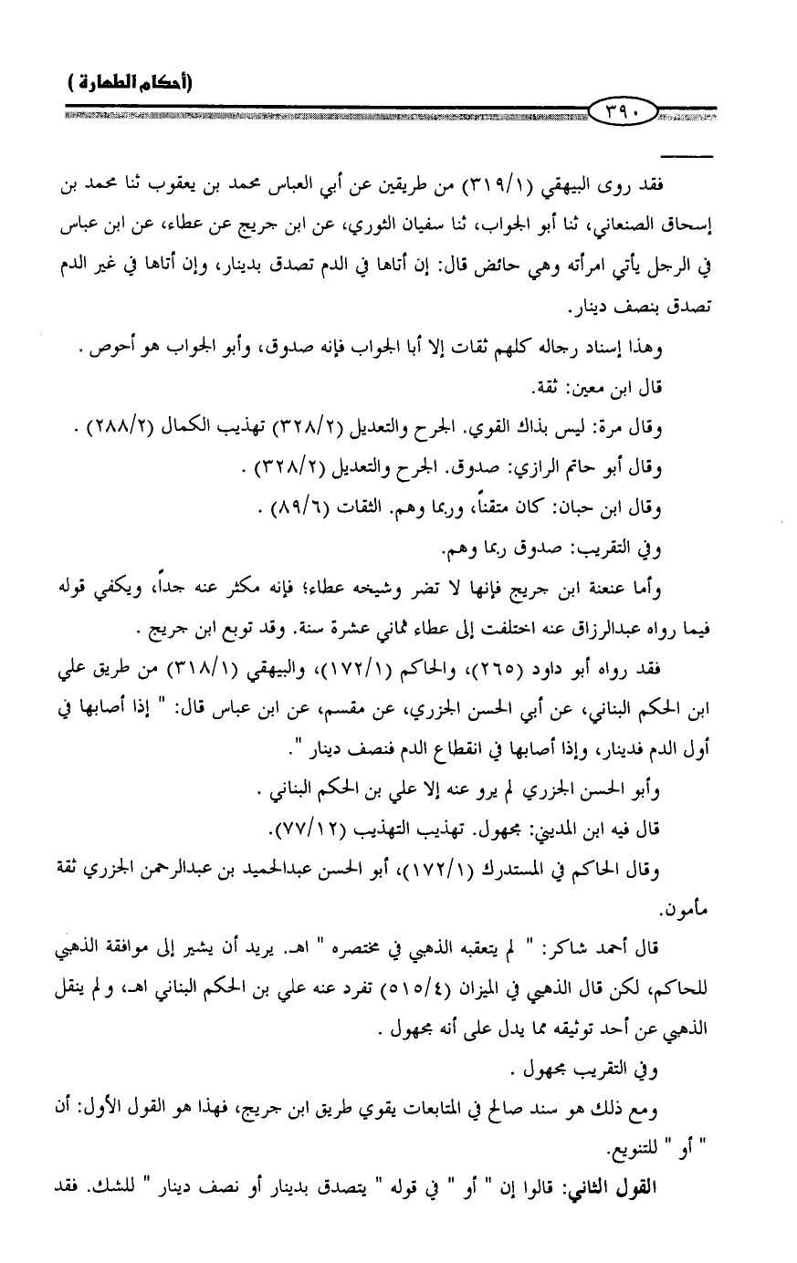 فقد روى البيهقي (1/ 319) من طريقين عن أبي العباس محمد بن يعقوب ثنا محمد بن إسحاق الصنعاني، ثنا أبو الجواب، ثنا سفيان الثوري، عن ابن جريج عن عطاء، عن ابن عباس في الرجل يأتي امرأته وهي حائض قال: إن أتاها في الدم تصدق بدينار، وإن أتاها في غير الدم تصدق بنصف دينار.
