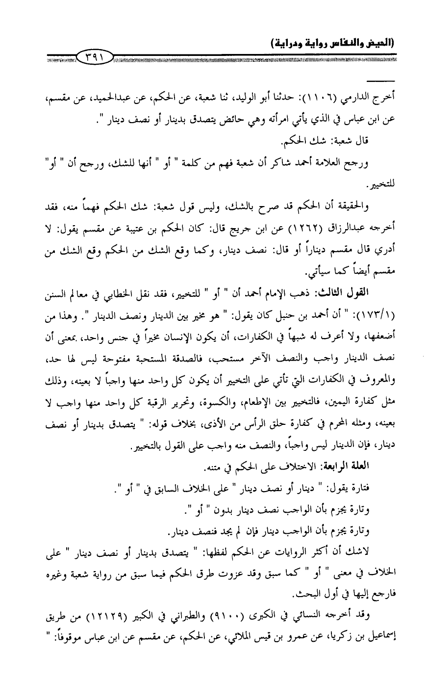 أخرج الدارمي (1106): حدثنا أبو الوليد، ثنا شعبة، عن الحكم، عن عبد الحميد، عن مقسم، عن ابن عباس في الذي يأتي امرأته وهى حائض يتصدق بدينار أو نصف دينار".