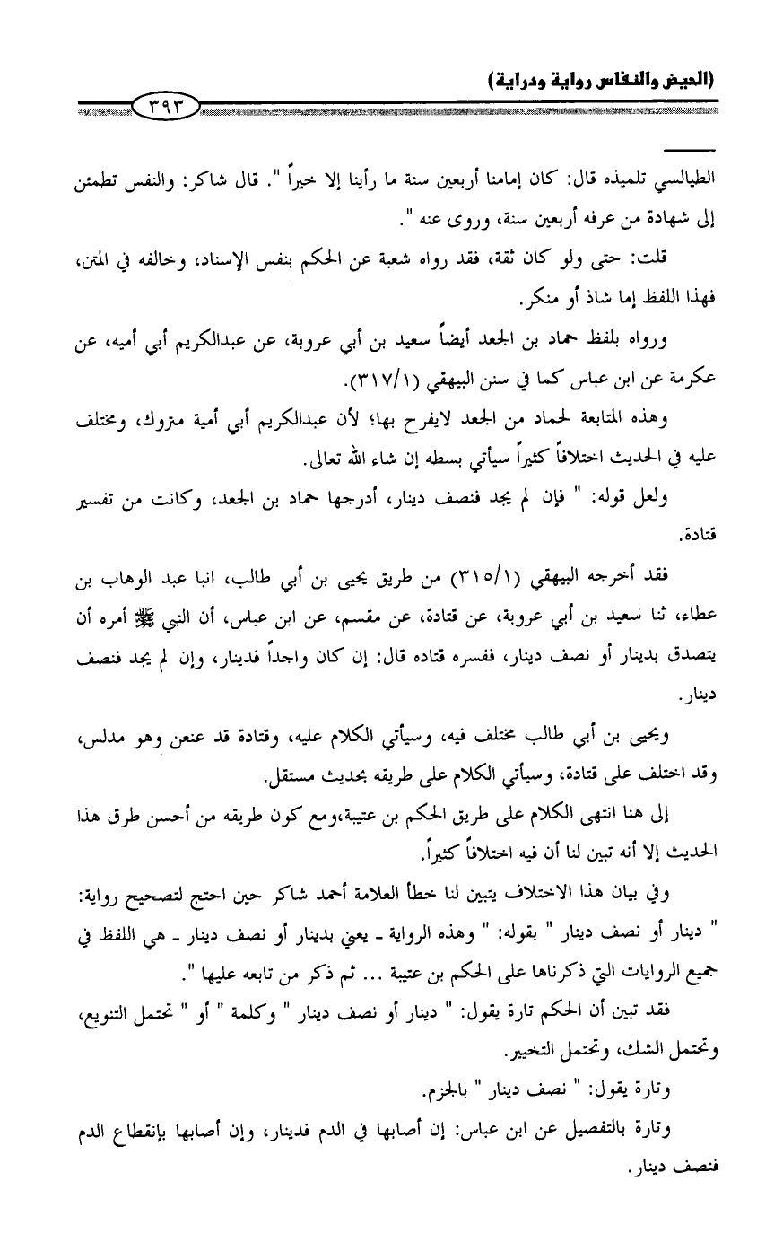 وفي بيان هذا الاختلاف يتبين لنا خطأ العلامة أحمد شاكر حين احتج لتصحيح رواية: "دينار أو نصف دينار" بقوله: "وهذه الرواية - يعني بدينار أو نصف دينار - هي اللفظ في جميع الروايات التي ذكرناها على الحكم بن عتيبة ... ثم ذكر من تابعه عليها".