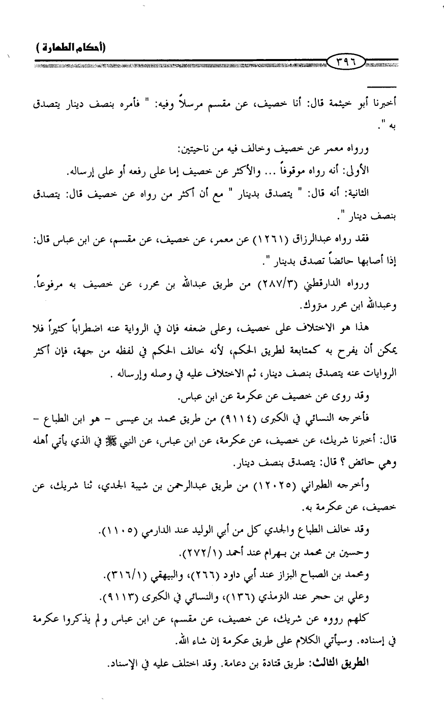 هذا هو الاختلاف على خصيف، وعلى ضعفه فإن في الرواية عنه اضطراباً كثيراً فلا يمكن أن يفرح به كمتابعة لطريق الحكم، لأنه خالف الحكم في لفظه من جهة، فإن أكثر الروايات عنه يتصدق بنصف دينار، ثم الاختلاف عليه في وصله وإرساله.