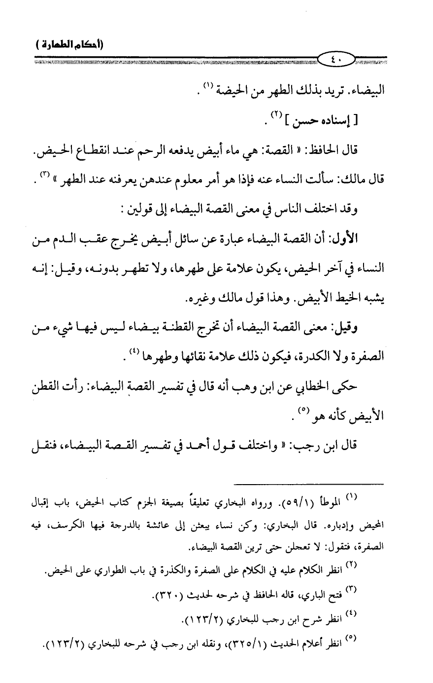 (¬1) الموطأ (1/ 59). ورواه البخاري تعليقاً بصيغة الجزم كتاب الحيض، باب إقبال المحيض وإدباره. قال البخاري: وكن نساء يبعثن إلى عائشة بالدرجة فيها الكرسف، فيه الصفرة، فتقول: لا تعجلن حتى ترين القصة البيضاء.