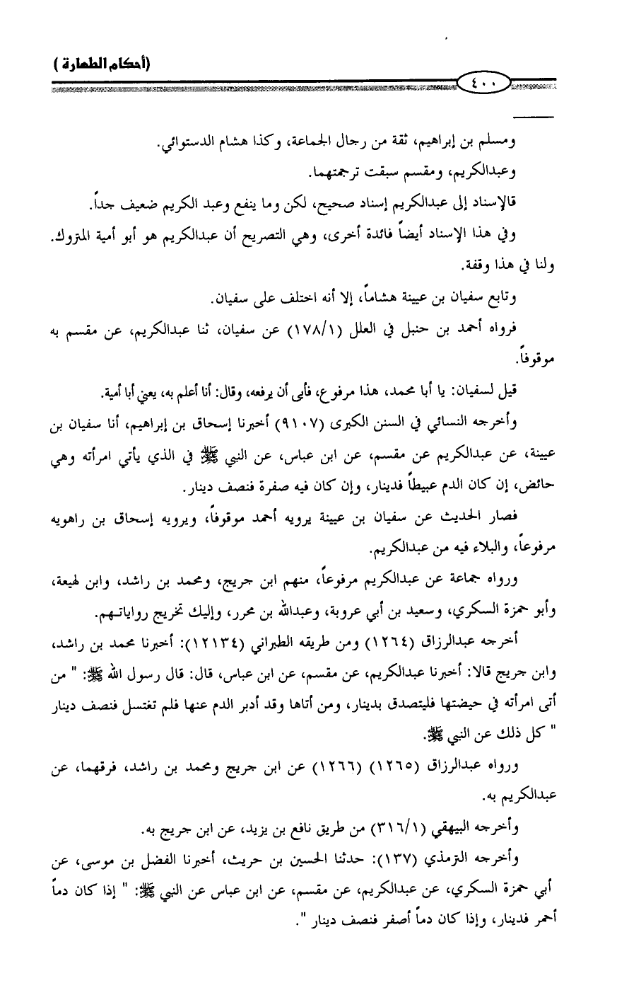 وأخرجه النسائي في السنن الكبرى (9107) أخبرنا إسحاق بن إبراهيم، أنا سفيان بن عيينة، عن عبد الكريم عن مقسم، عن ابن عباس، عن النبي - صلى الله عليه وسلم - في الذي يأتي امرأته وهي حائض، إن كان الدم عبيطاً فدينار، وإن كان فيه صفرة فنصف دينار.