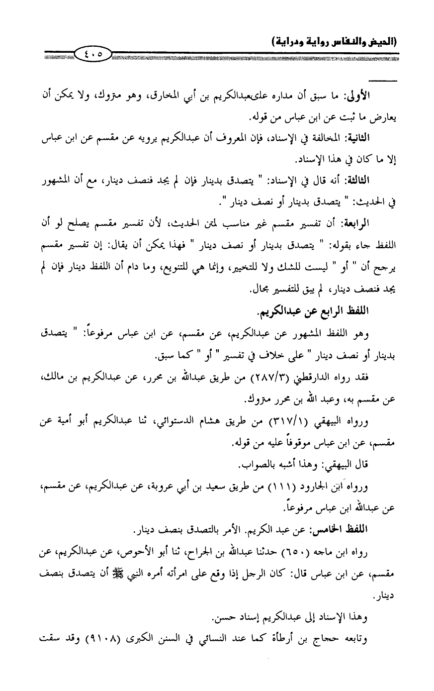 وهو اللفظ المشهور عن عبد الكريم، عن مقسم، عن ابن عباس مرفوعاً: "يتصدق بدينار أو نصف دينار" على خلاف في تفسير "أو" كما سبق.