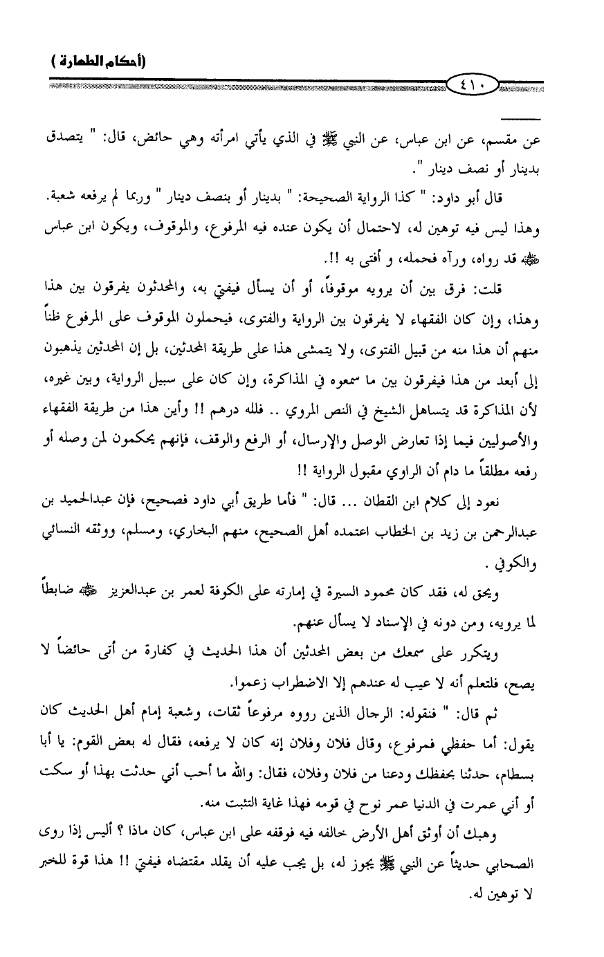 ويتكرر على سمعك من بعض المحدثين أن هذا الحديث في كفارة من أتى حائضاً لا يصح، فلتعلم أنه لا عيب له عندهم إلا الاضطراب زعموا.