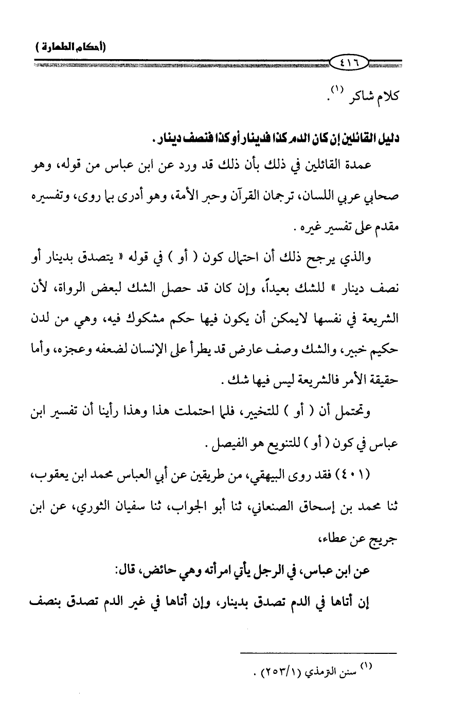 دليل القائلين إن كان الدم كذا فدينار أو كذا فنصف دينار.