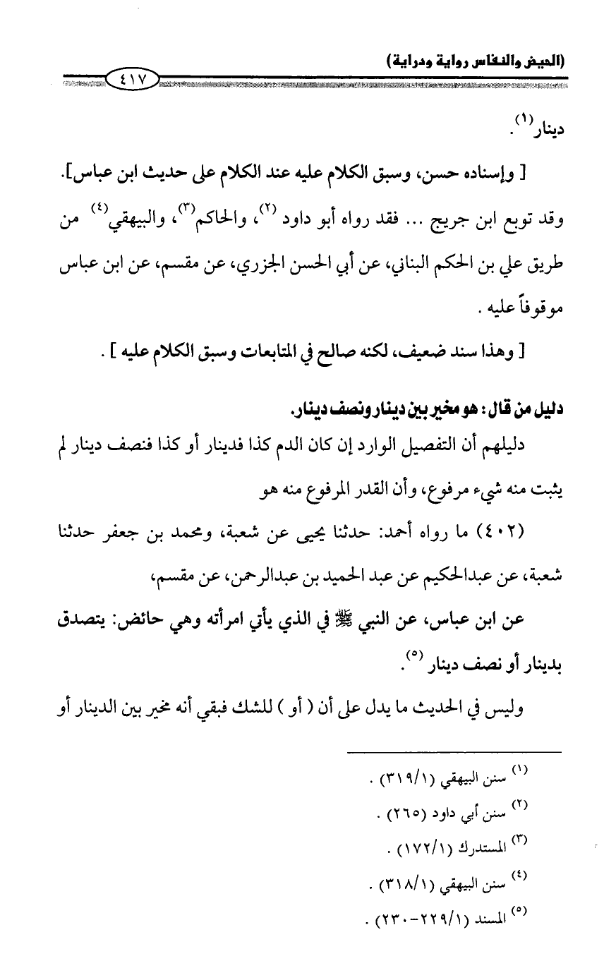 عن ابن عباس، عن النبي - صلى الله عليه وسلم - في الذي يأتي امرأته وهي حائض: يتصدق بدينار أو نصف دينار (¬5).