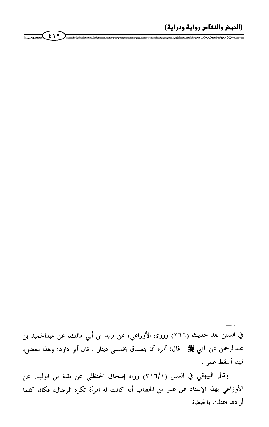 في السنن بعد حديث (266) وروى الأوزاعي، عن يزبد بن أبي مالك، عن عبد الحميد بن عبد الرحمن عن النبي - صلى الله عليه وسلم - قال: أمره أن يتصدق بخمسي دينار. قال أبو داود: وهذا معضل، فهنا أسقط عمر.
