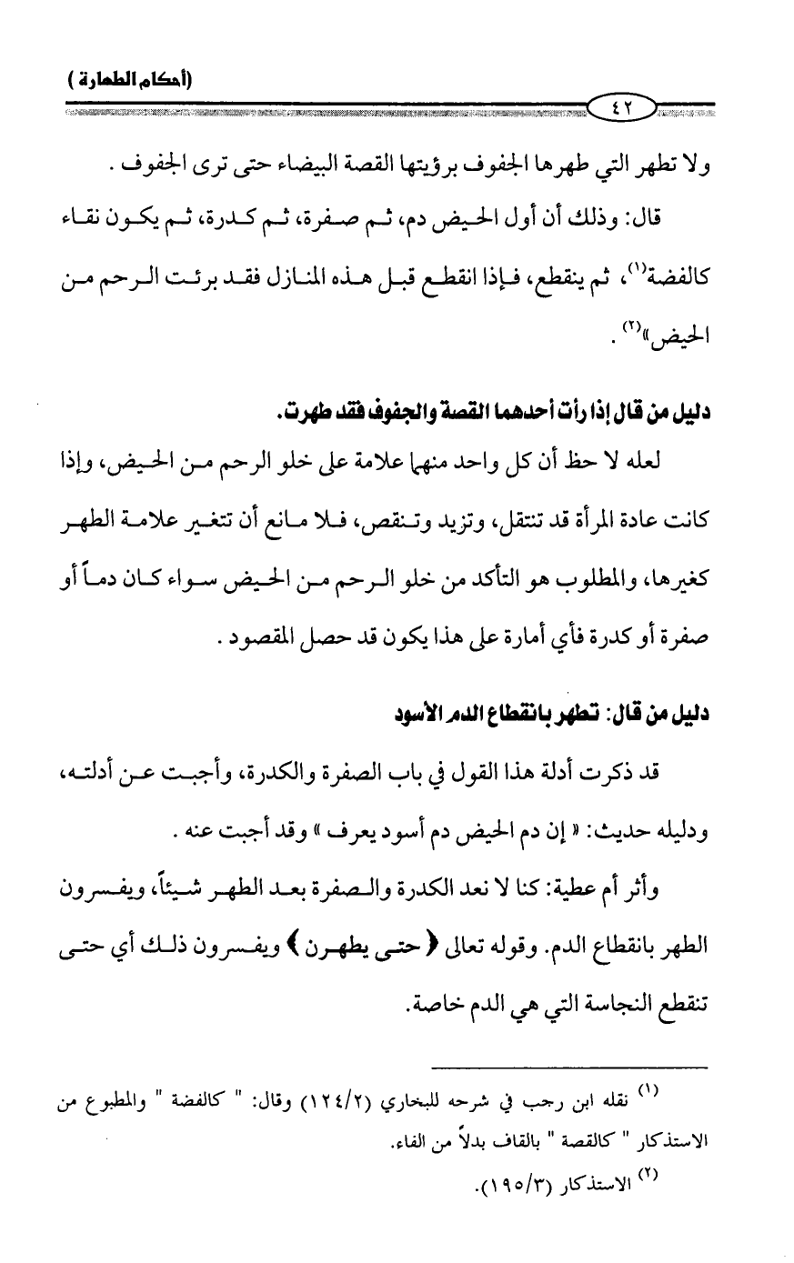 دليل من قال إذا رأت أحدهما القصة والجفوف فقد طهرت.