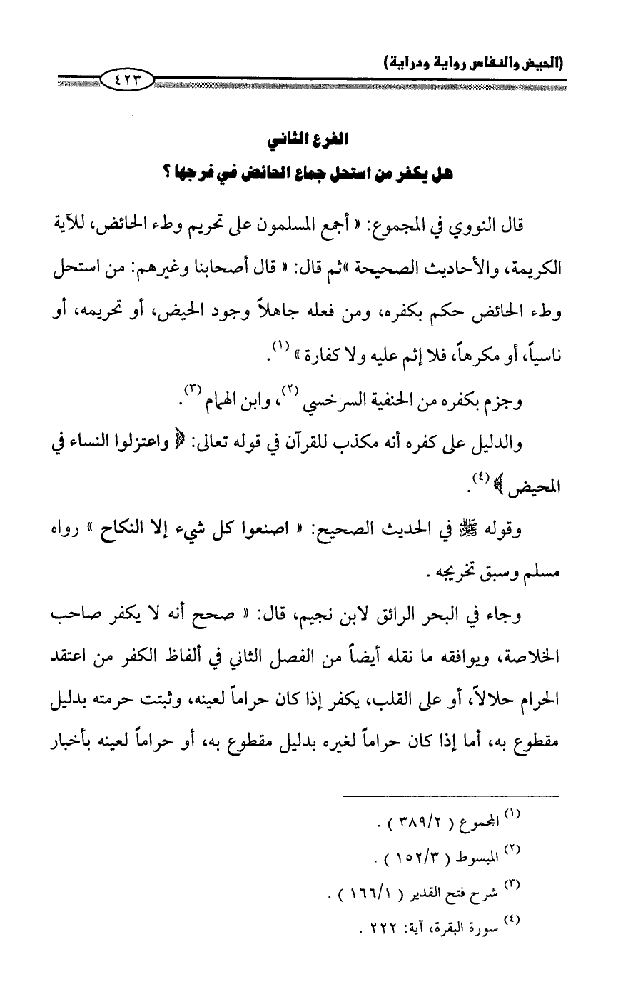 الفرع الثاني: هل يكفر من استحل جماع الحائض في فرجها؟