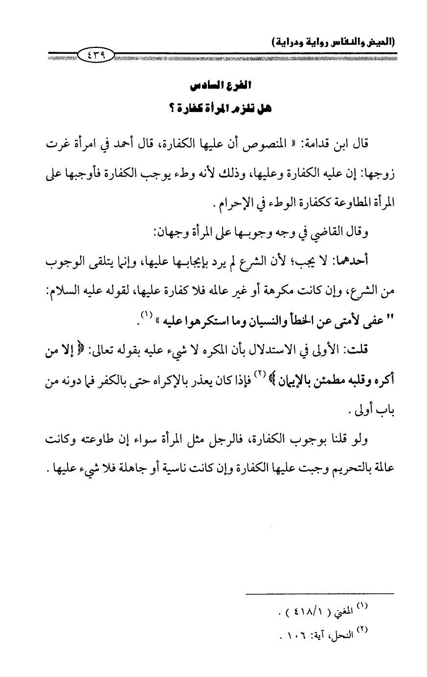 الفرع السادس: هل تلزم المرأة كفارة؟
