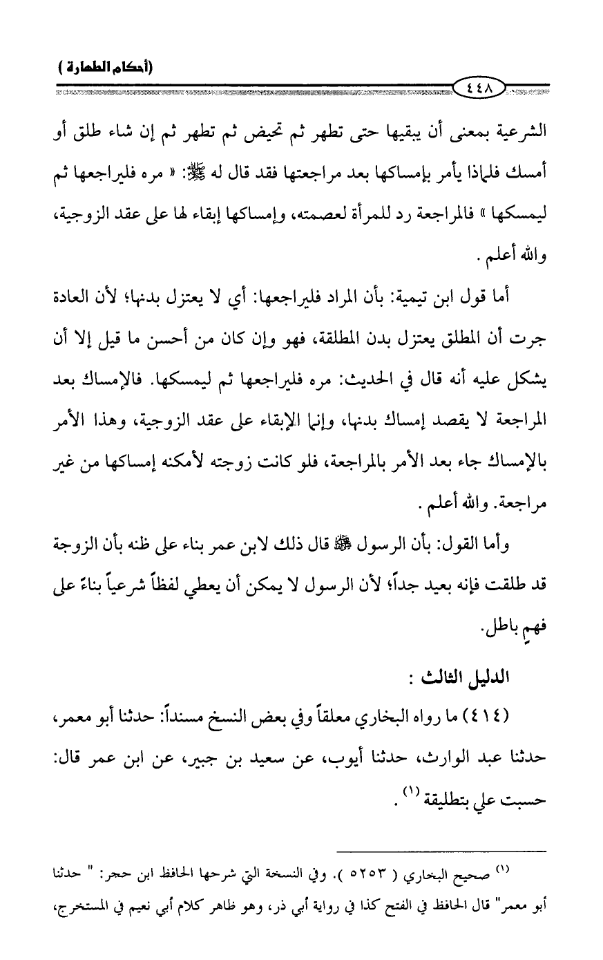 (414) ما رواه البخاري معلقاً وفي بعض النسخ مسنداً: حدثنا أبو معمر، حدثنا عبد الوارث، حدثنا أيوب، عن سعيد بن جبير، عن ابن عمر قال: حسبت علي بتطليقة (¬1).