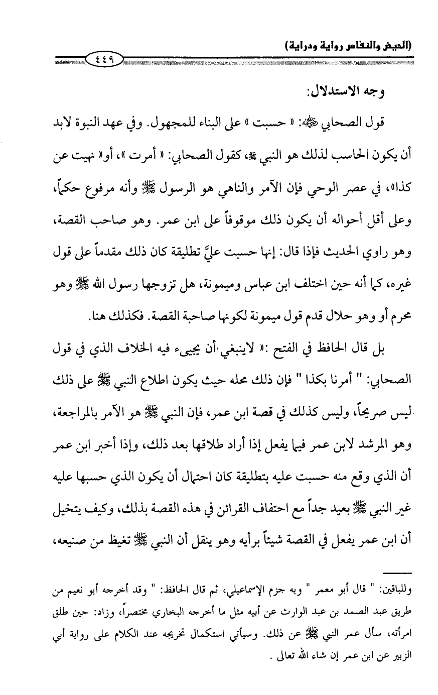 بل قال الحافظ في الفتح: "لا ينبغي أن يجيئ فيه الخلاف الذي في قول الصحابي: "أمرنا بكذا" فإن ذلك محله حيث يكون اطلاع النبي - صلى الله عليه وسلم - على ذلك ليس صريحاً، وليس كذلك في قصة ابن عمر، فإن النبي - صلى الله عليه وسلم - هو الآمر بالمراجعة، وهو المرشد لابن عمر فيما يفعل إذا أراد طلاقها بعد ذلك، وإذا أخبر ابن عمر أن الذي وقع منه حسبت عليه بتطليقة كان احتمال أن يكون الذي حسبها عليه غير النبي - صلى الله عليه وسلم - بعيد جداً مع احتفاف القرائن في هذه القصة بذلك، وكيف يتخيل أن ابن عمر يفعل في القصة شيئاً برأيه وهو ينقل أن النبي - صلى الله عليه وسلم - تغيظ من صنيعه،