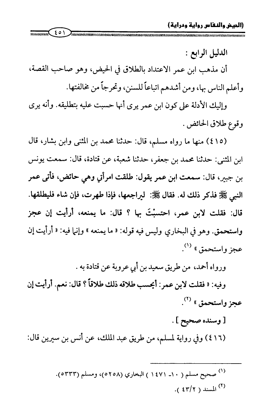 (415) منها ما رواه مسلم، قال: حدثنا محمد بن المثنى وابن بشار، قال ابن المثنى: حدثنا محمد بن جعفر، حدثنا شعبة، عن قتادة، قال: سمعت يونس بن جبير، قال: سمعت ابن عمر يقول: طلقت امرأتي وهي حائض، فأتى عمر النبي - صلى الله عليه وسلم - فذكر ذلك له. فقال - صلى الله عليه وسلم -: ليراجعها، فإذا طهرت، فإن شاء فليطلقها. قال: فقلت لابن عمر، احتسبْتَ بها؟ قال: ما يمنعه، أرأيت إن عجز واستحمق. وهو في البخاري وليس فيه قوله: "ما يمنعه" وإنما فيه: "أرأيت إن عجز واستحمق" (¬1).