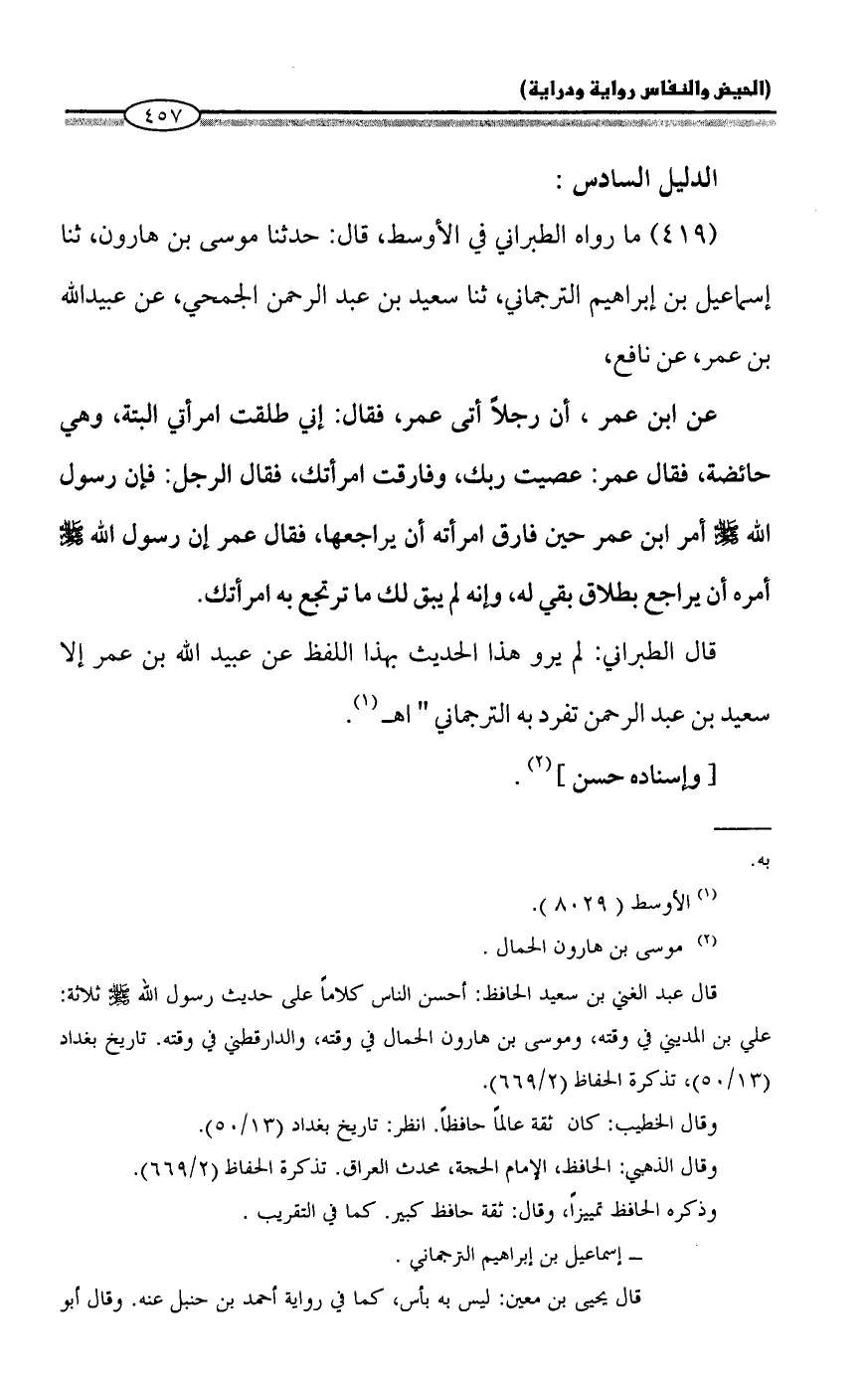 (419) ما رواه الطبراني في الأوسط، قال: حدثنا موسى بن هارون، ثنا إسماعيل بن إبراهيم الترجماني، ثنا سعيد بن عبد الرحمن الجمحي، عن عبيد الله بن عمر، عن نافع،