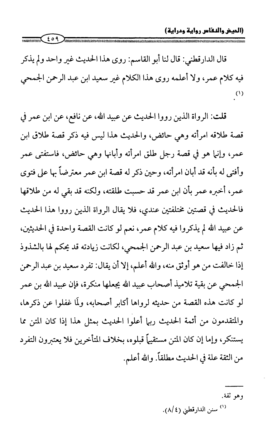 قلت: الرواة الذين رووا الحديث عن عبيد الله، عن نافع، عن ابن عمر في قصة طلاقه امرأته وهي حائض، والحديث هذا ليس فيه ذكر قصة طلاق ابن عمر، وإنما هو في قصة رجل طلق امرأته وأبانها وهي حائض، فاستفتى عمر وأفتى له بأنه قد أبان امرأته، وحين ذكر له قصة ابن عمر معترضاً بها على فتوى عمر، أخبره عمر بأن ابن عمر قد حسبت طلقته، ولكنه قد بقي له من طلاقها فالحديث في قصتين مختلفتين عندي، فلا يقال الرواة الذين رووا هذا الحديث عن عبيد الله لم يذكروا فيه كلام عمر، نعم لو كانت القصة واحدة في الحديثين، ثم زاد فيها سعيد بن عبد الرحمن الجمحي، لكانت زيادته قد يحكم لها بالشذوذ إذا خالفت من هو أوثق منه، والله أعلم، إلا أن يقال: تفرد سعيد بن عبد الرحمن الجمحي عن بقية تلاميذ أصحاب عبيد الله يجعلها منكرة، فإن عبيد الله بن عمر لو كانت هذه القصة من حديثه لرواها أكابر أصحابه، ولمَا غفلوا عن ذكرها، والمتقدمون من أئمة الحديث ربما أعلوا الحديث بمثل هذا إذا كان المتن مما يستنكر، وإما إن كان المتن مستقيماً قبلوه، بخلاف المتأخرين فلا يعتبرون التفرد من الثقة علة في الحديث مطلقاً. والله أعلم.