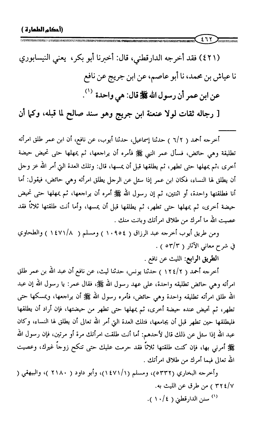 (421) فقد أخرجه الدارقطني، قال: أخبرنا أبو بكر، يعني النيسابوري نا عياش بن محمد، نا أبو عاصم، عن ابن جريج عن نافع