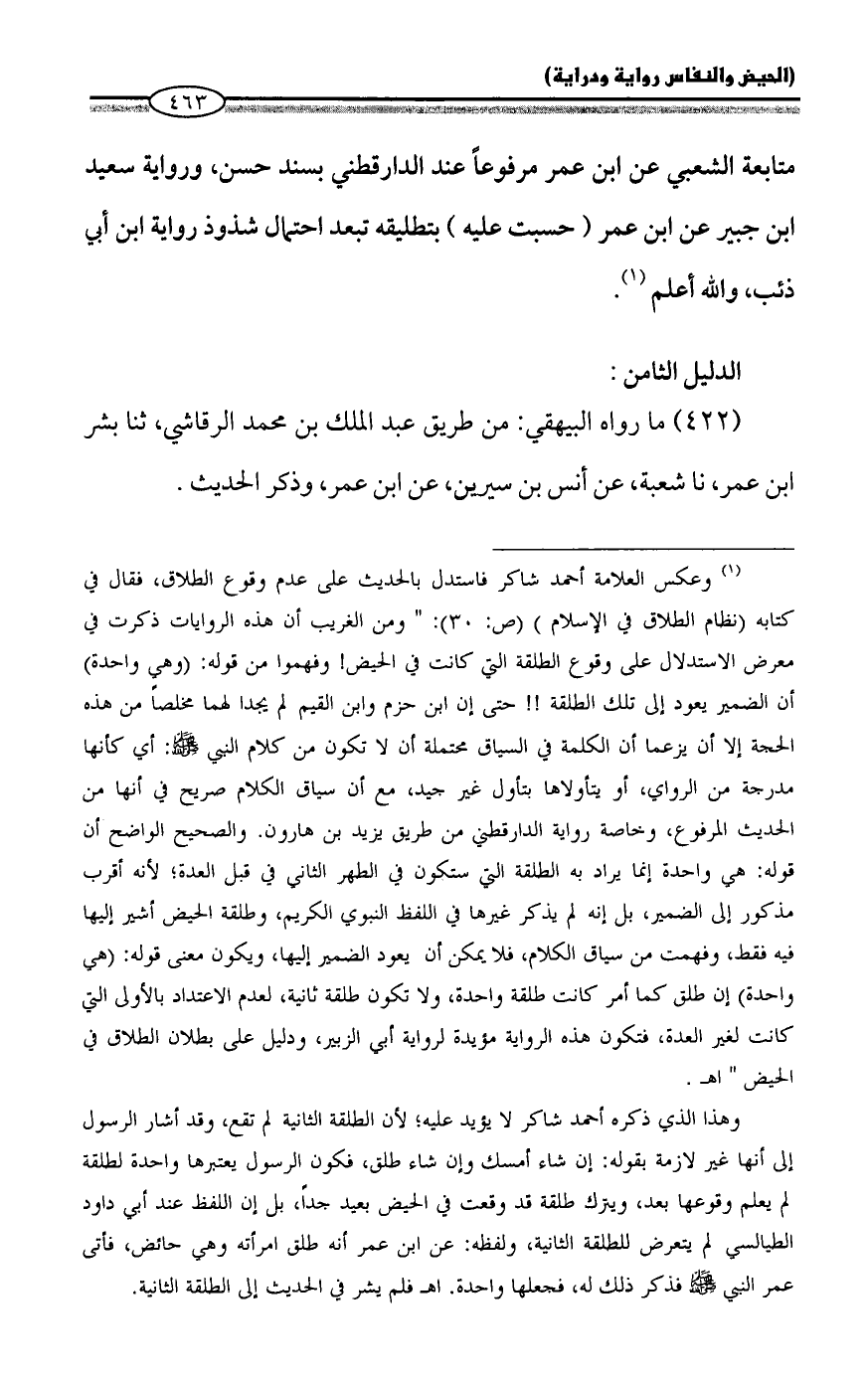 (¬1) وعكس العلامة أحمد شاكر فاستدل بالحديث على عدم وقوع الطلاق، فقال في كتابه (نظام الطلاق في الإسلام) (ص: 30): "ومن الغريب أن هذه الروايات ذكرت في معرض الاستدلال على وقوع الطلقة التي كانت في الحيض! وفهموا من قوله: (وهي واحدة) أن الضمير يعود إلى تلك الطلقة!! حتى إن ابن حزم وابن القيم لم يجدا لهما مخلصاً من هذه الحجة إلا أن يزعما أن الكلمة في السياق محتملة أن لا تكون من كلام النبي - صلى الله عليه وسلم -: أي كأنها مدرجة من الرواي، أو يتأولاها بتأول غير جيد، مع أن سياق الكلام صريح في أنها من الحديث المرفوع، وخاصة رواية الدارقطني من طريق يزيد بن هارون. والصحيح الواضح أن قوله: هي واحدة إنما يراد به الطلقة التي ستكون في الطهر الثاني في قبل العدة؛ لأنه أقرب مذكور إلى الضمير، بل إنه لم يذكر غيرها في اللفظ النبوي الكريم، وطلقة الحيض أشير إليها فيه فقط، وفهمت من سياق الكلام، فلا يمكن أن يعود الضمير إليها، ويكون معنى قوله: (هي واحدة) إن طلق كما أمر كانت طلقة واحدة، ولا تكون طلقة ثانية، لعدم الاعتداد بالأولى التي كانت لغير العدة، فتكون هذه الرواية مؤيدة لرواية أبي الزبير، ودليل على بطلان الطلاق في الحيض" اهـ.