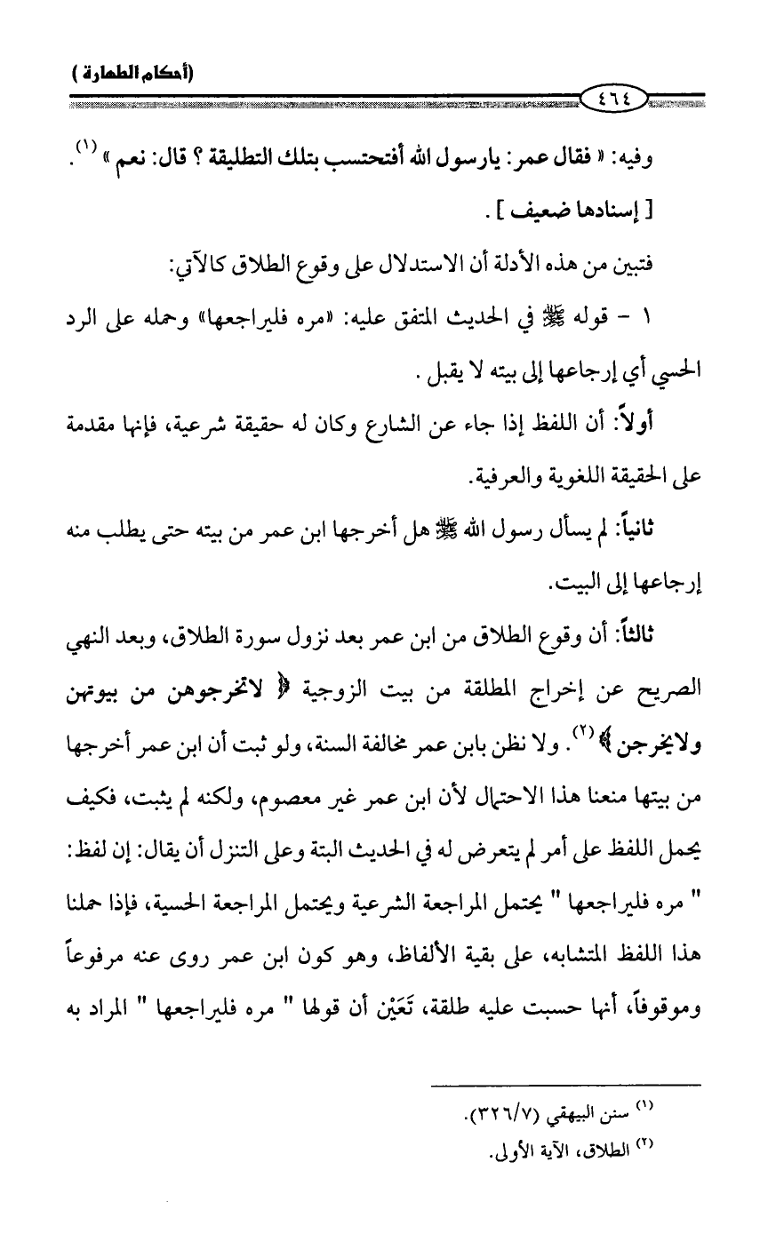 ثالثاً: أن وقوع الطلاق من ابن عمر بعد نزول سورة الطلاق، وبعد النهي الصريح عن إخراج المطلقة من بيت الزوجية {لَا تُخْرِجُوهُنَّ مِنْ بُيُوتِهِنَّ وَلَا يَخْرُجْنَ} (¬2). ولا نظن بابن عمر مخالفة السنة، ولو ثبت أن ابن عمر أخرجها من بيتها منعنا هذا الاحتمال لأن ابن عمر غير معصوم، ولكنه لم يثبت، فكيف يحمل اللفظ على أمر لم يتعرض له في الحديث البتة وعلى التنزل أن يقال: إن لفظ: "مره فليراجعها" يحتمل المراجعة الشرعية ويحتمل المراجعة الحسية، فإذا حملنا هذا اللفظ المتشابه، على بقية الألفاظ، وهو كون ابن عمر روى عنه مرفوعاً وموقوفاً، أنها حسبت عليه طلقة، تَعَيْن أن قولها "مره فليراجعها" المراد به