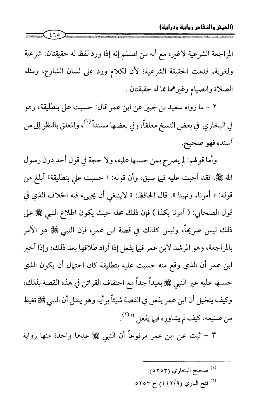 وأما قولهم: لم يصرح بمن حسبها عليه، ولا حجة في قول أحد دون رسول الله - صلى الله عليه وسلم -. فقد أجبت عليه فيما سبق، وأن قوله: "حسبت علي بتطليقة" أبلغ من قوله: "أمرنا، ونهينا". قال الحافظ: "لا ينبغي أن يجيء فيه الخلاف الذي في قول الصحابي: (أمرنا بكذا) فإن ذلك محله حيث يكون اطلاع النبي - صلى الله عليه وسلم - على ذلك ليس صريحاً، وليس كذلك في قصة ابن عمر، فإن النبي - صلى الله عليه وسلم - هو الآمر بالمراجعة، وهو المرشد لابن عمر فيما يفعل إذا أراد طلاقها بعد ذلك، وإذا أخبر ابن عمر أن الذي وقع منه حسبت عليه بتطليقة كان احتمال أن يكون الذي حسبها عليه غير النبي - صلى الله عليه وسلم - بعيداً جداً مع احتفاف القرائن في هذه القصة بذلك، وكيف يتخيل أن ابن عمر يفعل في القصة شيئاً برأيه وهو ينقل أن النبي - صلى الله عليه وسلم - تغيظ من صنيعه، كيف لم يشاوره فيما يفعل" (¬2).