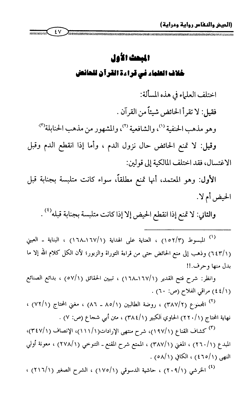 (¬1) المبسوط (3/ 152)، العناية على الهداية (1/ 167 - 168)، البناية - العيني (1/ 643) وذهب إلى منع الحائض حتى من قراءة التوراة والزبور؛ لأن الكل كلام الله إلا ما بدل منها وحرف.!!