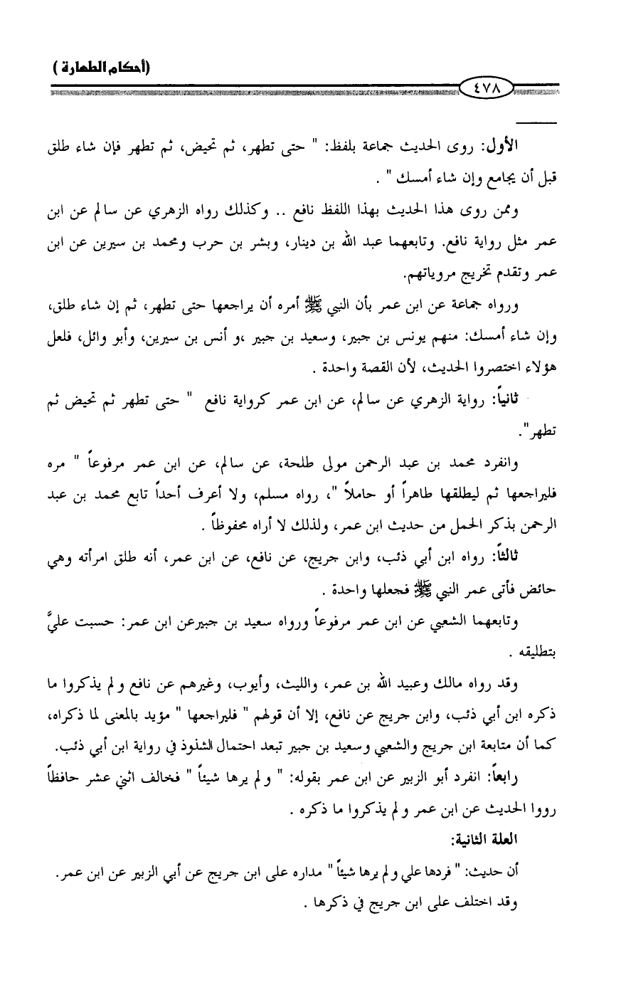 ورواه جماعة عن ابن عمر بأن النبي - صلى الله عليه وسلم - أمره أن يراجعها حتى تطهر، ثم إن شاء طلق، وإن شاء أمسك: منهم يونس بن جبير، وسعيد بن جبير، وأنس بن سيرين، وأبو وائل، فلعل هؤلاء اختصروا الحديث، لأن القصة واحدة.