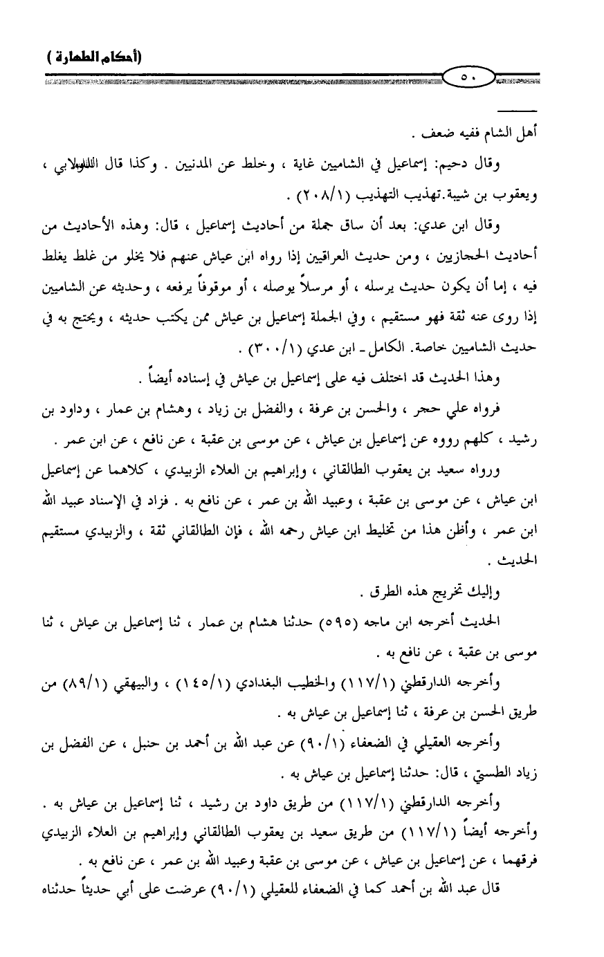 وأخرجه الدارقطني (1/ 117) من طريق داود بن رشيد، ثنا إسماعيل بن عياش به. وأخرجه أيضاً (1/ 117) من طريق سعيد بن يعقوب الطالقاني وإبراهيم بن العلاء الزبيدي فرقهما، عن إسماعيل بن عياش، عن موسى بن عقبة وعبيد الله بن عمر، عن نافع به.