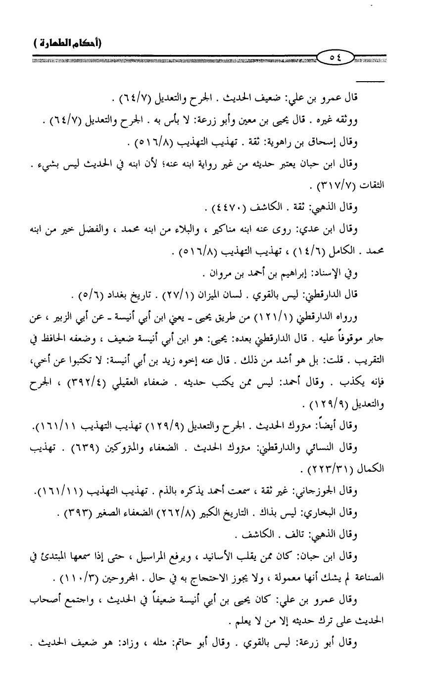 ورواه الدارقطني (1/ 121) من طريق يحيى - يعنى ابن أبي أنيسة - عن أبي الزبير، عن جابر موقوفاً عليه. قال الدارقطني بعده: يحيى: هو ابن أبي أنيسة ضعيف، وضعفه الحافظ في التقريب. قلت: بل هو أشد من ذلك. قال عنه إخوه زيد بن أبي أنيسة: لا تكتبوا عن أخي، فإنه يكذب. وقال أحمد: ليس ممن يكتب حديثه. ضعفاء العقيلي (4/ 392)، الجرح والتعديل (9/ 129).