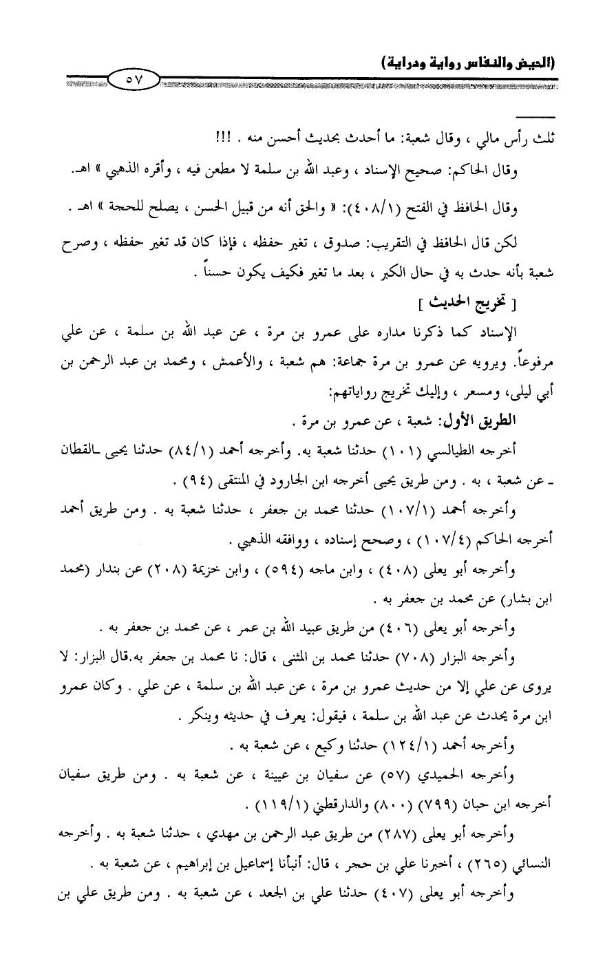 الإسناد كما ذكرنا مداره على عمرو بن مرة، عن عبد الله بن سلمة، عن علي مرفوعاً. ويرويه عن عمرو بن مرة جماعة: هم شعبة، والأعمش، ومحمد بن عبد الرحمن بن أبي ليلى، ومسعر، وإليك تخريج رواياتهم: