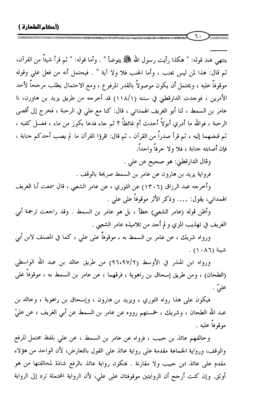 ينتهي عند قوله: "هكذا رأيت رسول الله - صلى الله عليه وسلم - يتوضأ". وأما قوله: "ثم قرأ شيئاً من القرآن، ثم قال: هذا لمن ليس بجنب، وأما الجنب فلا ولا آية". فيحتمل أنه من فعل علي وقوله موقوفاً عليه، ويحتمل أن يكون موصولاً بالقدر المرفوع، ومع الاحتمال يطلب مرجحاً لأحد الأمرين، فوجدت الدارقطني في سننه (1/ 118) قد أخرجه من طريق يزيد بن هارون، نا عامر بن السمط، ثنا أبو الغريف الهمداني، قال: كنا مع علي في الرحبة، فخرج إلى أقصى الرحبة، فوالله ما أدري أبولاً أحدث أم غائطاً؟ ثم جاء فدعا بكوز من ماء، فغسل كفيه، ثم قبضهما إليه، ثم قرأ صدراً من القرآن، ثم قال: اقرؤا القرآن ما لم يصب أحدكم جنابة، فإن أصابته جنابة، فلا ولا حرفاً واحداً.