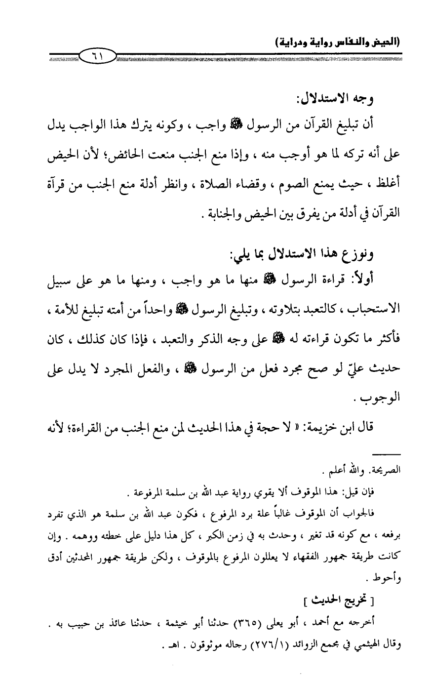 أن تبليغ القرآن من الرسول - صلى الله عليه وسلم - واجب، وكونه يترك هذا الواجب يدل على أنه تركه لما هو أوجب منه، وإذا منع الجنب منعت الحائض؛ لأن الحيض أغلظ، حيث يمنع الصوم، وقضاء الصلاة، وانظر أدلة منع الجنب من قراءة القرآن في أدلة من يفرق بين الحيض والجنابة.