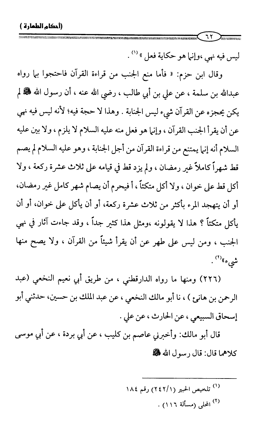 وقال ابن حزم: "فأما منع الجنب من قراءة القرآن فاحتجوا بما رواه عبد الله بن سلمة، عن علي بن أبي طالب، رضي الله عنه، أن رسول الله - صلى الله عليه وسلم - لم يكن يحجزه عن القرآن شيء ليس الجنابة. وهذا لا حجة فيه؛ لأنه ليس فيه نهي عن أن يقرأ الجنب القرآن، وإنما هو فعل منه عليه السلام لا يلزم، ولا بين عليه السلام أنه إنما يمتنع من قراءة القرآن من أجل الجنابة، وهو عليه السلام لم يصم قط شهراً كاملاً غير رمضان، ولم يزد قط في قيامه على ثلاث عشرة ركعة، ولا أكل قط على خوان، ولا أكل متكئاً، أفيحرم أن يصام شهر كامل غير رمضان، أو أن يتهجد المرء بأكثر من ثلاث عشرة ركعة، أو أن يأكل على خوان، أو أن يأكل متكئاً؟ هذا لا يقولونه، ومثل هذا كثير جداً، وقد جاءت آثار في نهي الجنب، ومن ليس على طهر عن أن يقرأ شيئاً من القرآن، ولا يصح منها شيء" (¬2).