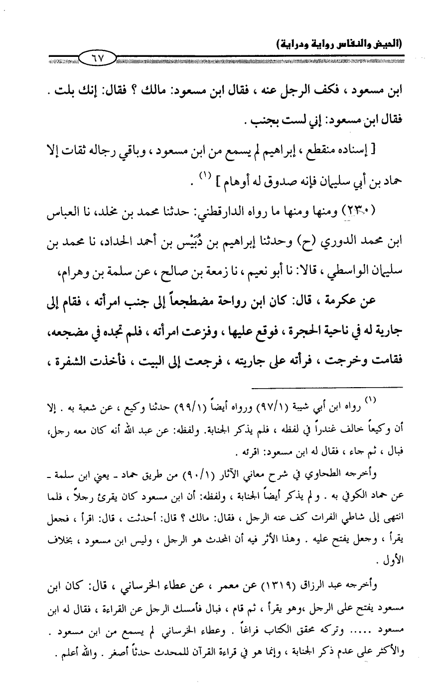 (230) ومنها ومنها ما رواه الدارقطني: حدثنا محمَّد بن مخلد، نا العباس ابن محمَّد الدوري (ح) وحدثنا إبراهيم بن دُبَيْس بن أحمد الحداد، نا محمد بن سليمان الواسطي، قالا: نا أبو نعيم، نا زمعة بن صالح، عن سلمة بن وهرام، عن عكرمة، قال: كان ابن رواحة مضطجعاً إلى جنب امرأته، فقام إلى جارية له في ناحية الحجرة، فوقع عليها، وفزعت امرأته، فلم تجده في مضجعه، فقامت وخرجت، فرأته على جاريته، فرجعت إلى البيت، فأخذت الشفرة،