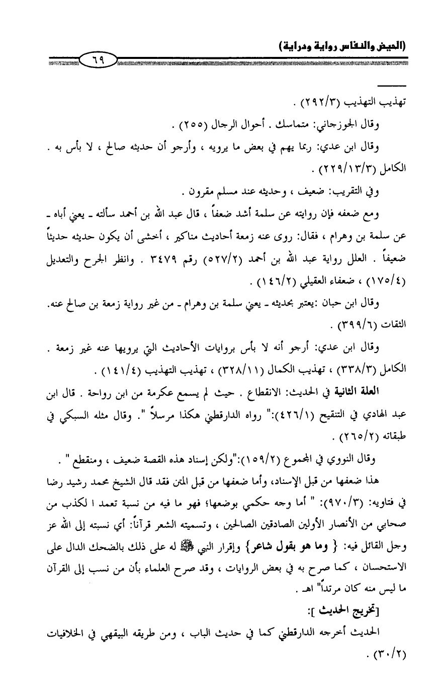 ومع ضعفه فإن روايته عن سلمة أشد ضعفاً، قال عبد الله بن أحمد سألته - يعني أباه - عن سلمة بن وهرام، فقال: روى عنه زمعة أحاديث مناكير، أخشى أن يكون حديثه حديثاً ضعيفاً. العلل رواية عبد الله بن أحمد (2/ 527) رقم 3479. وانظر الجرح والتعديل (4/ 175)، ضعفاء العقيلي (2/ 146).