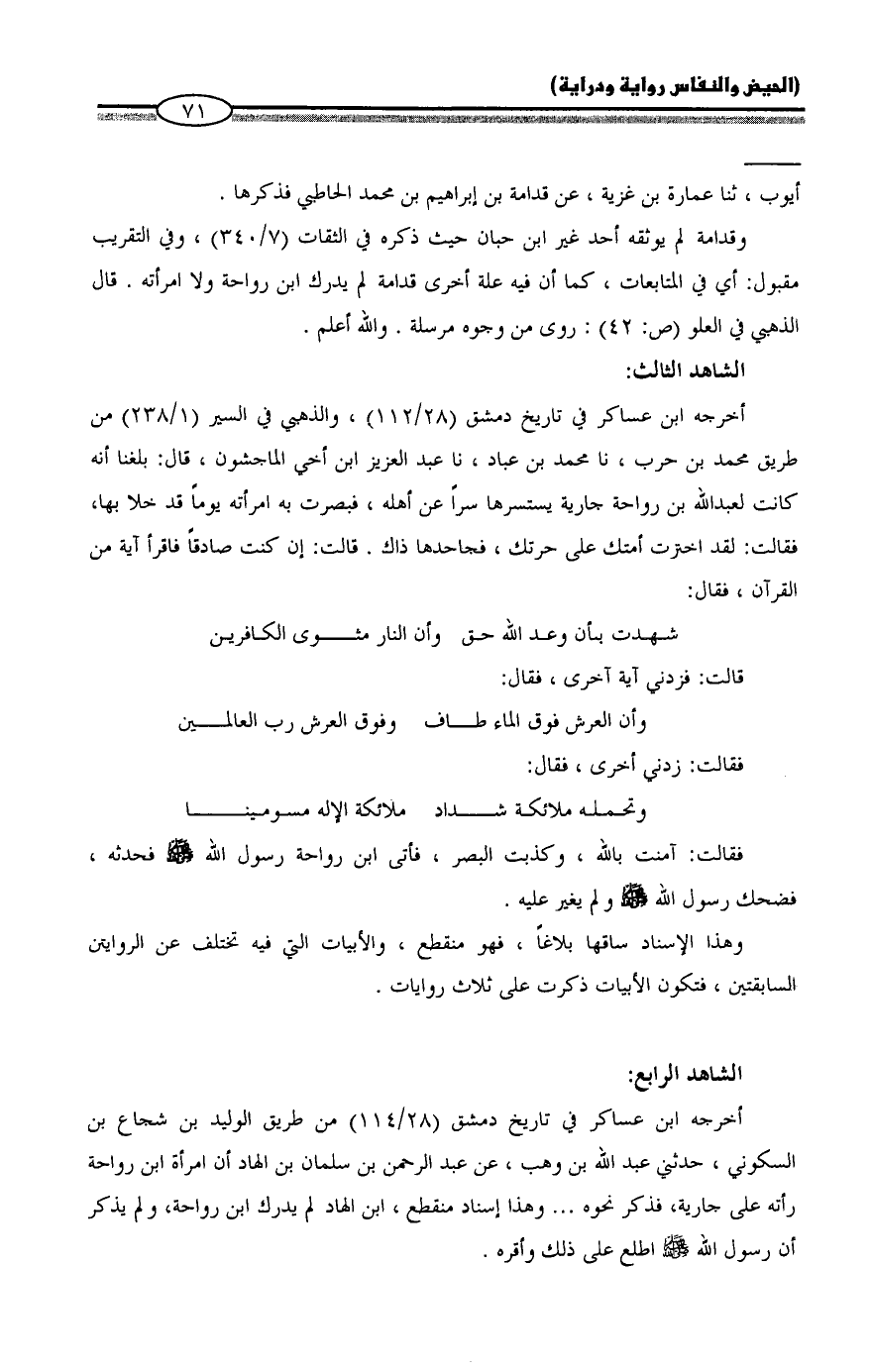 وقدامة لم يوثقه أحد غير ابن حبان حيث ذكره في الثقات (7/ 340)، وفي التقريب مقبول: أي في المتابعات، كما أن فيه علة أخرى قدامة لم يدرك ابن رواحة ولا امرأته. قال الذهبي في العلو (ص: 42): روى من وجوه مرسلة. والله أعلم.