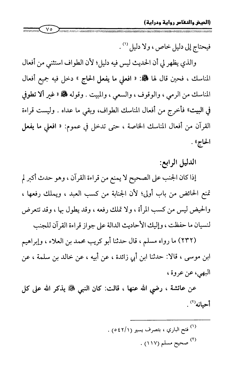 والذي يظهر لي أن الحديث ليس فيه دليل؛ لأن الطواف استثني من أفعال المناسك، فحين قال لها - صلى الله عليه وسلم -: "افعلي ما يفعل الحاج" دخل فيه جميع أفعال المناسك من الرمي، والوقوف، والسعي، والمبيت. وقوله - صلى الله عليه وسلم - "غير ألا تطوفي في البيت" فأخرج من أفعال المناسك الطواف، وبقي ما عداه. وليست قراءة القرآن من أفعال المناسك الخاصة، حتى تدخل في عموم: "افعلي ما يفعل الحاج".