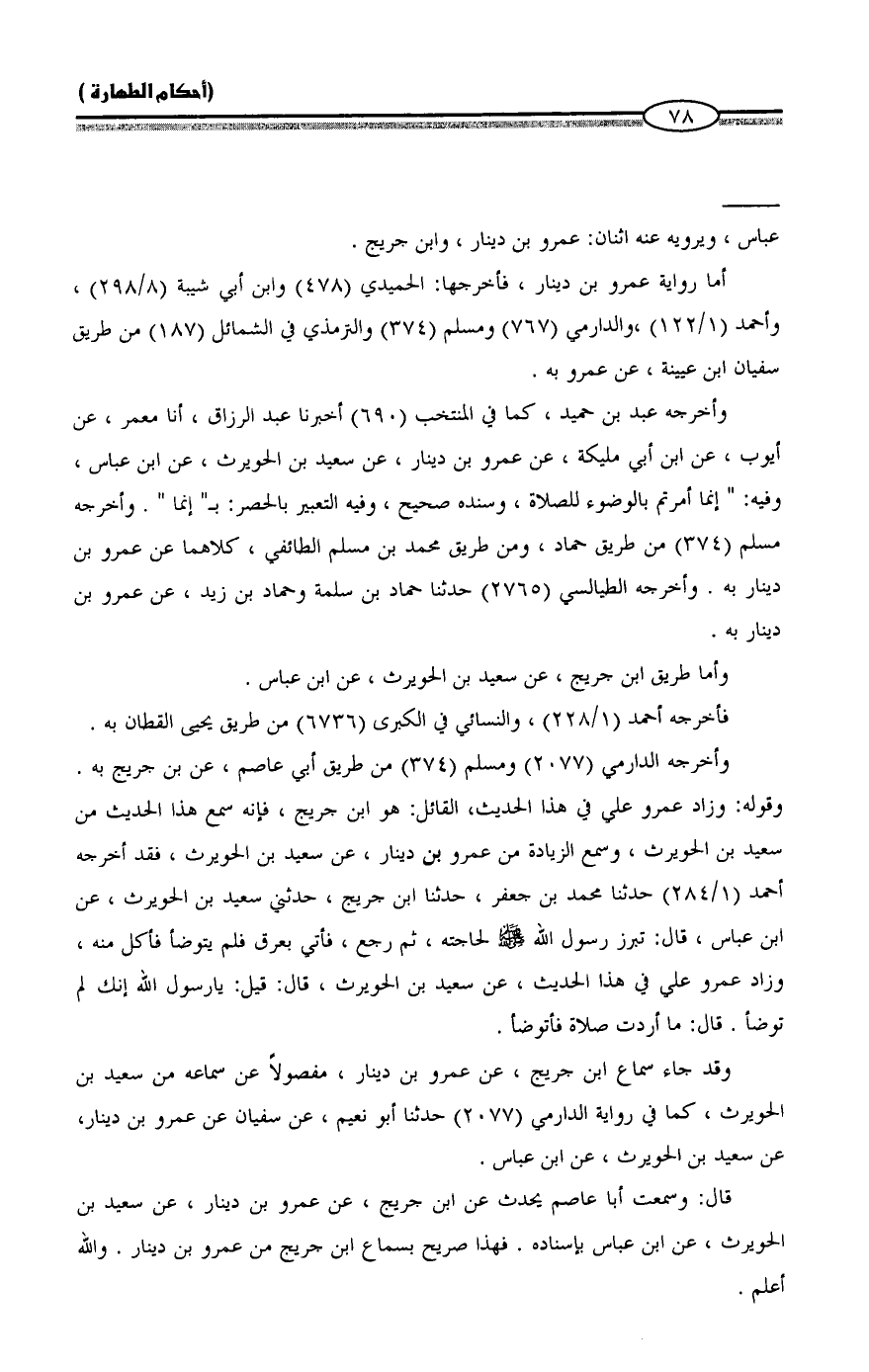 وأخرجه عبد بن حميد، كما في المنتخب (690) أخبرنا عبد الرزاق، أنا معمر، عن أيوب، عن ابن أبي مليكة، عن عمرو بن دينار، عن سعيد بن الحويرث، عن ابن عباس، وفيه: "إنما أمرتم بالوضوء للصلاة، وسنده صحيح، وفيه التعبير بالحصر: بـ "إنما". وأخرجه مسلم (374) من طريق حماد، ومن طريق محمد بن مسلم الطائفي، كلاهما عن عمرو بن دينار به. وأخرجه الطيالسي (2765) حدثنا حماد بن سلمة وحماد بن زيد، عن عمرو بن دينار به.