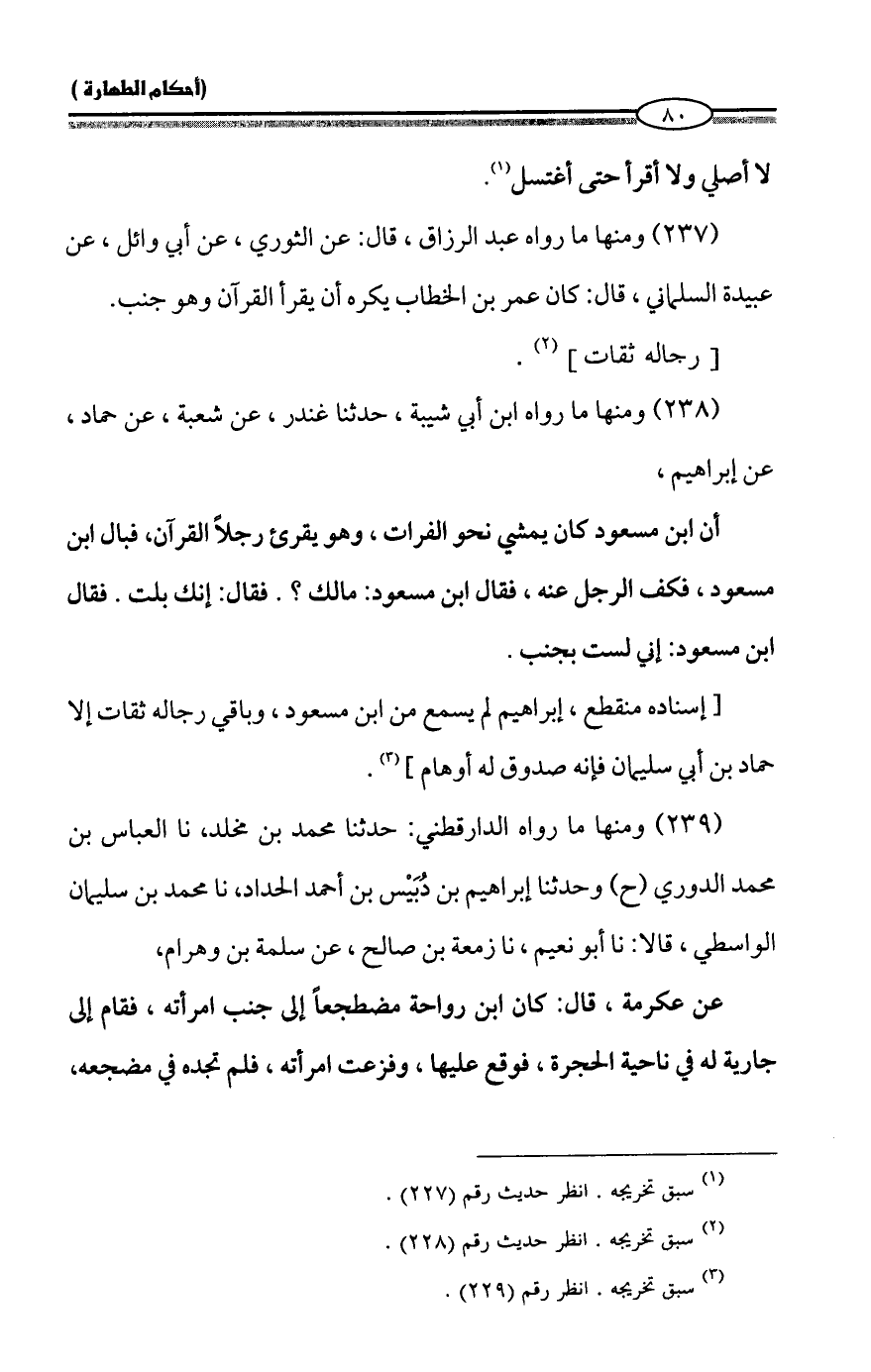 (237) ومنها ما رواه عبد الرزاق، قال: عن الثوري، عن أبي وائل، عن عبيدة السلماني، قال: كان عمر بن الخطاب يكره أن يقرأ القرآن وهو جنب.