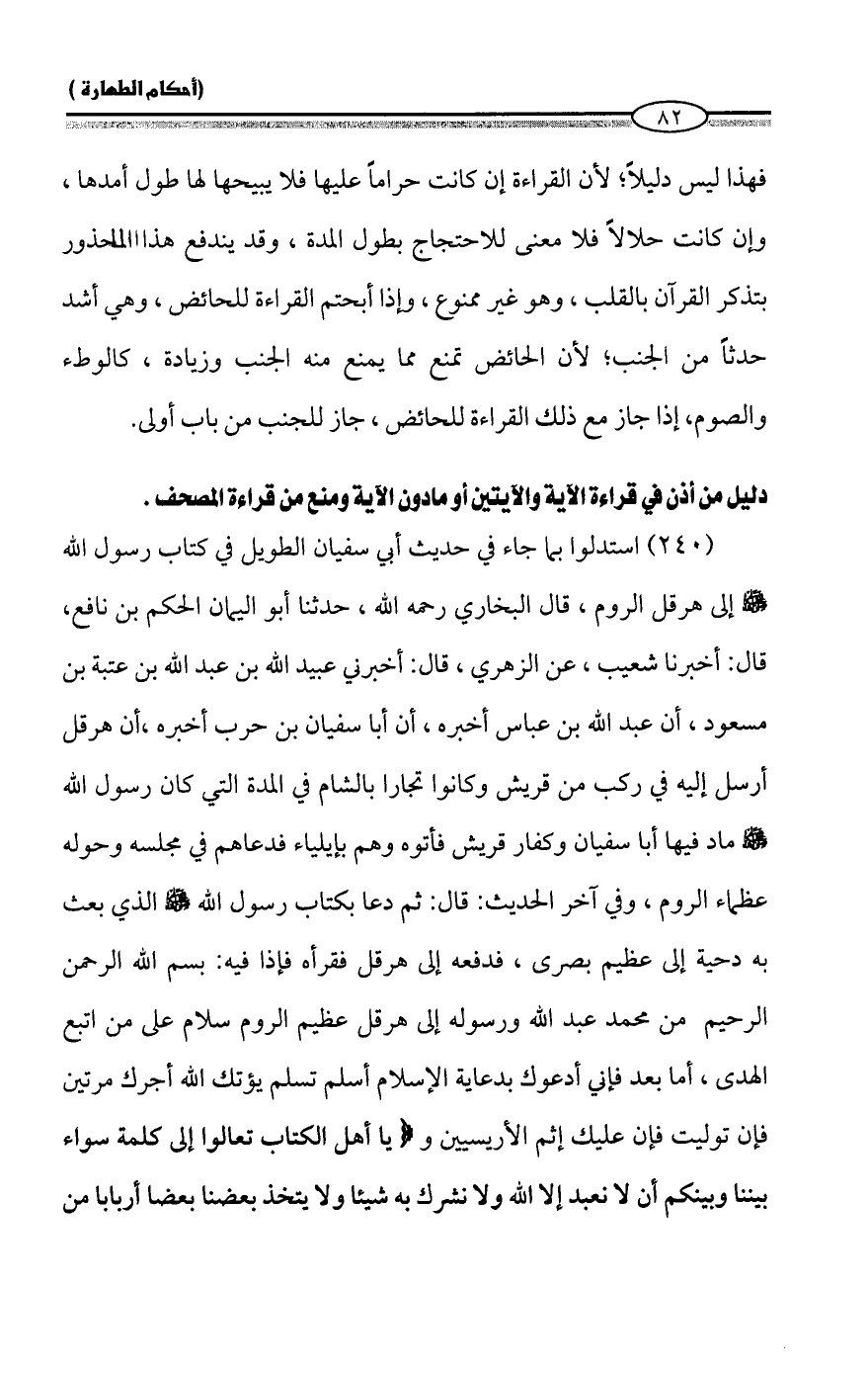 (240) استدلوا بما جاء في حديث أبي سفيان الطويل في كتاب رسول الله - صلى الله عليه وسلم - إلى هرقل الروم، قال البخاري رحمه الله، حدثنا أبو اليمان الحكم بن نافع، قال: أخبرنا شعيب، عن الزهري، قال: أخبرني عبيد الله بن عبد الله بن عتبة بن مسعود، أن عبد الله بن عباس أخبره، أن أبا سفيان بن حرب أخبره، أن هرقل أرسل إليه في ركب من قريش وكانوا تجارًا بالشام في المدة التي كان رسول الله - صلى الله عليه وسلم - ماد فيها أبا سفيان وكفار قريش فأتوه وهم بإيلياء فدعاهم في مجلسه وحوله عظماء الروم، وفي آخر الحديث: قال: ثم دعا بكتاب رسول الله - صلى الله عليه وسلم - الذي بعث به دحية إلى عظيم بصري، فدفعه إلى هرقل فقرأه فإذا فيه: بِسْمِ اللَّهِ الرَّحْمَنِ الرَّحِيمِ من محمد عبد الله ورسوله إلى هرقل عظيم الروم سلام على من اتبع الهدى، أما بعد فإني أدعوك بدعاية الإسلام أسلم تسلم يؤتك الله أجرك مرتين فإن توليت فإن عليك إثم الأريسيين و {يَاأَهْلَ الْكِتَابِ تَعَالَوْا إِلَى كَلِمَةٍ سَوَاءٍ بَيْنَنَا وَبَيْنَكُمْ أَلَّا نَعْبُدَ إِلَّا اللَّهَ وَلَا نُشْرِكَ بِهِ شَيْئًا وَلَا يَتَّخِذَ بَعْضُنَا بَعْضًا أَرْبَابًا مِنْ