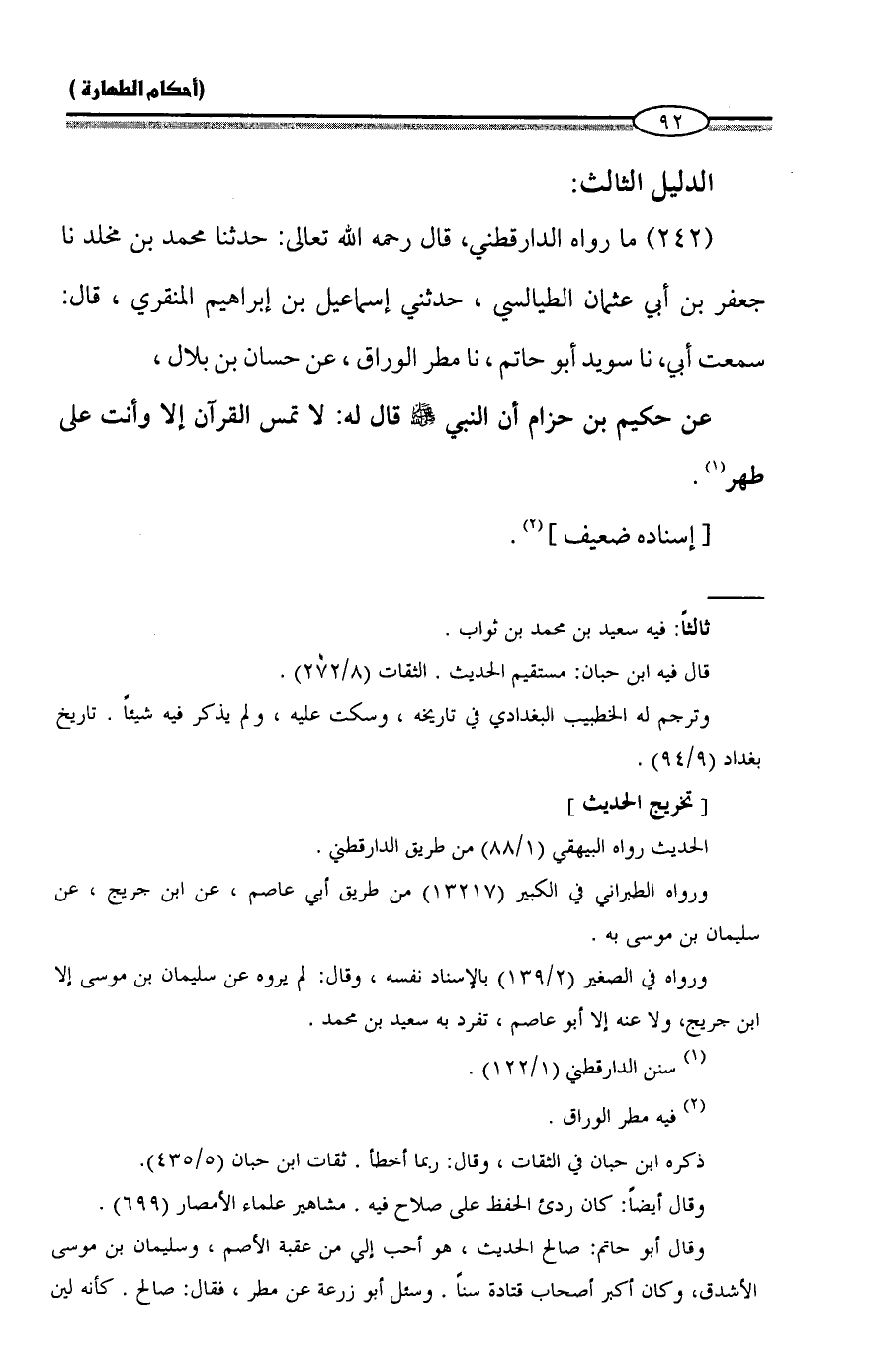 عن حكيم بن حزام أن النبي - صلى الله عليه وسلم - قال له: لا تمس القرآن إلا وأنت على طهر (¬1).