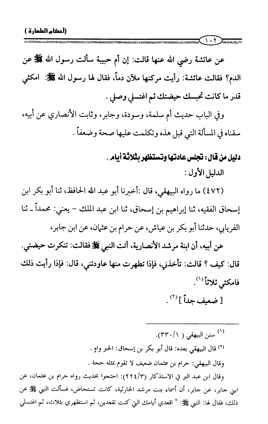 وقال ابن عبد البر في الاستذكار (3/ 224): احتجوا بحديث رواه حرام بن عثمان، عن ابني جابر، عن جابر، أن أسماء بنت مرشد الحارثية، كانت تستحاض، فسألت النبي - صلى الله عليه وسلم - عن ذلك، فقال لها: النبي - صلى الله عليه وسلم -: "اقعدي أيامك التي كنت تقعدين، ثم استظهري بثلاث، ثم اغتسلي