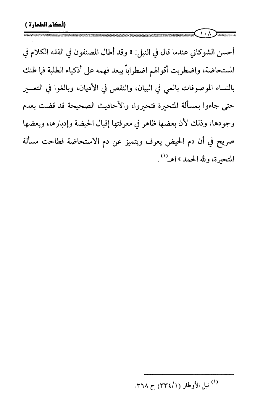 أحسن الشوكاني عندما قال في النيل: "وقد أطال المصنفون في الفقه الكلام في المستحاضة، واضطربت أقوالهم اضطراباً يبعد فهمه على أذكياء الطلبة فما ظنك بالنساء الموصوفات بالعي في البيان، والنقص في الأديان، وبالغوا في التعسير حتى جاءوا بمسألة المتحيرة فتحيروا، والأحاديث الصحيحة قد قضت بعدم وجودها، وذلك لأن بعضها ظاهر في معرفتها إقبال الحيضة وإدبارها، وبعضها صريح في أن دم الحيض يعرف ويتميز عن دم الاستحاضة فطاحت مسألة المتحيرة، ولله الحمد" اهـ (¬1).