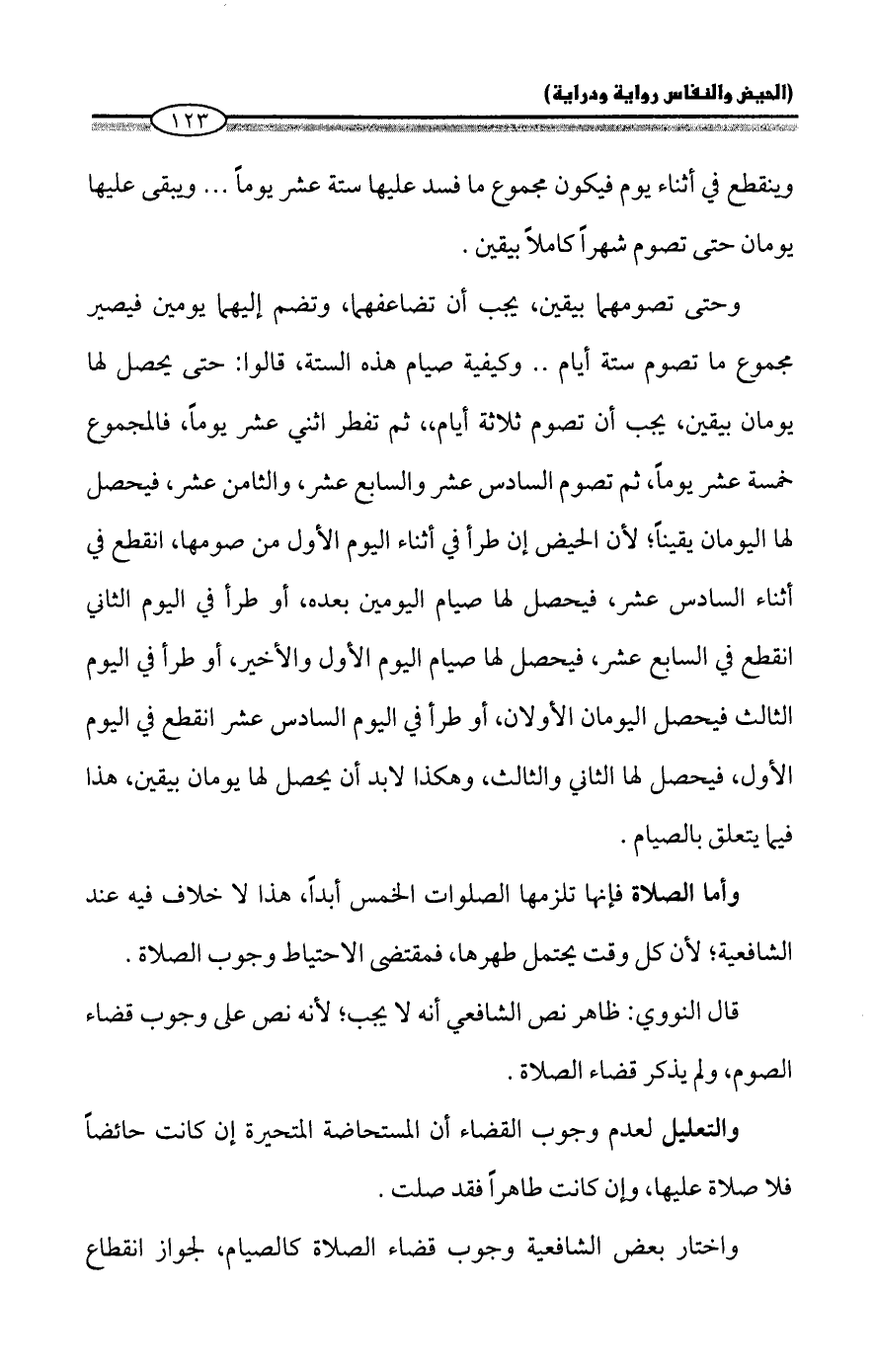 وحتى تصومهما بيقين، يجب أن تضاعفهما، وتضم إليهما يومين فيصير مجموع ما تصوم ستة أيام .. وكيفية صيام هذه الستة، قالوا: حتى يحصل لها يومان بيقين، يجب أن تصوم ثلاثة أيام،، ثم تفطر اثني عشر يوماً، فالمجموع خمسة عشر يوماً، ثم تصوم السادس عشر والسابع عشر، والثامن عشر، فيحصل لها اليومان يقيناً؛ لأن الحيض إن طرأ في أثناء اليوم الأول من صومها، انقطع في أثناء السادس عشر، فيحصل لها صيام اليومين بعده، أو طرأ في اليوم الثاني انقطع في السابع عشر، فيحصل لها صيام اليوم الأول والأخير، أو طرأ في اليوم الثالث فيحصل اليومان الأولان، أو طرأ في اليوم السادس عشر انقطع في اليوم الأول، فيحصل لها الثاني والثالث، وهكذا لا بد أن يحصل لها يومان بيقين، هذا فيما يتعلق بالصيام.